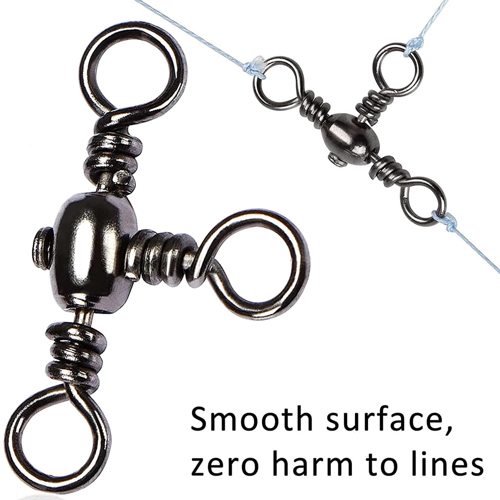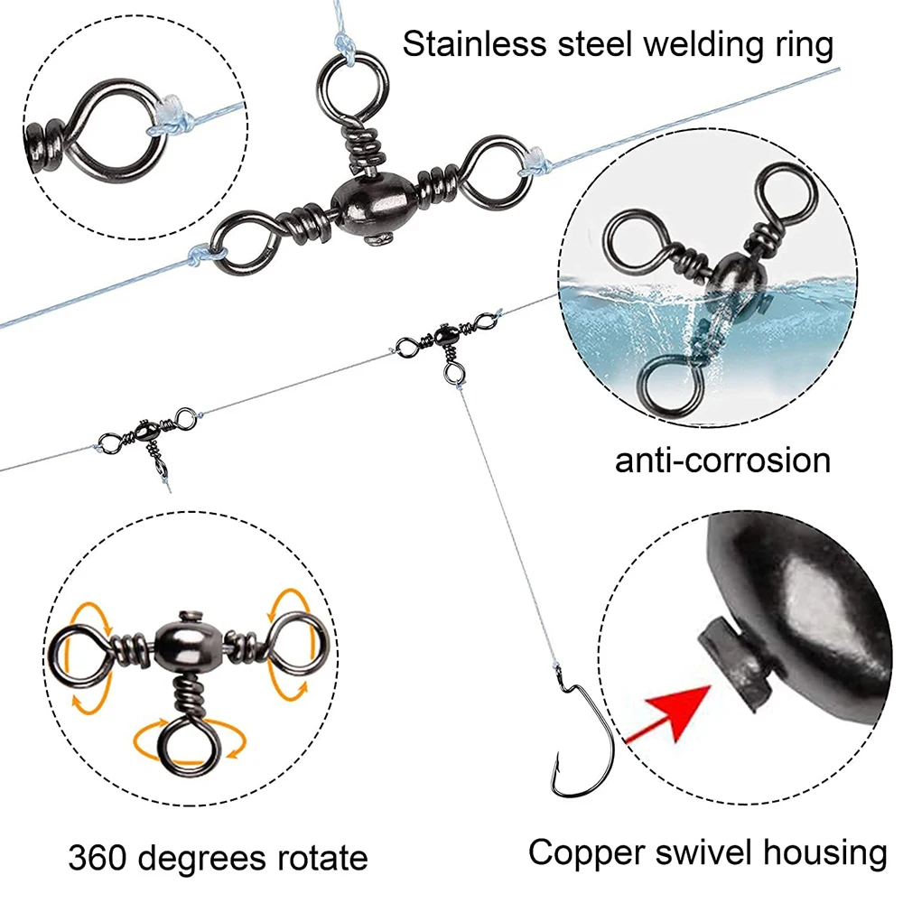3.Conector de sedal de pesca de 3 vías en forma de T, mucho mejor que los giratorios estándar, ideal para usar en agua salada, pesca con curricán de alta velocidad, jigging y aparejos de accesorios para señuelos de pesca de surf en alta mar.