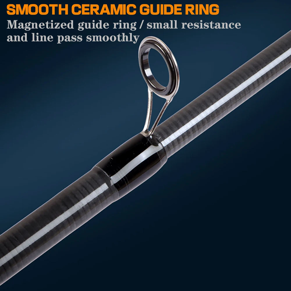 El agarre cómodo y segmentado y el mango EVA no solo proporcionan un agarre cómodo y antideslizante para sus manos, sino que también ayudan a reducir el trabajo, le permite pescar durante períodos de tiempo más largos sin experimentar fatiga. El anillo guía de cerámica suave reduce la fricción y disipa eficazmente el calor sin dañar el sedal, lo que garantiza que pueda pescar con facilidad y sin temor a dañar su equipo.