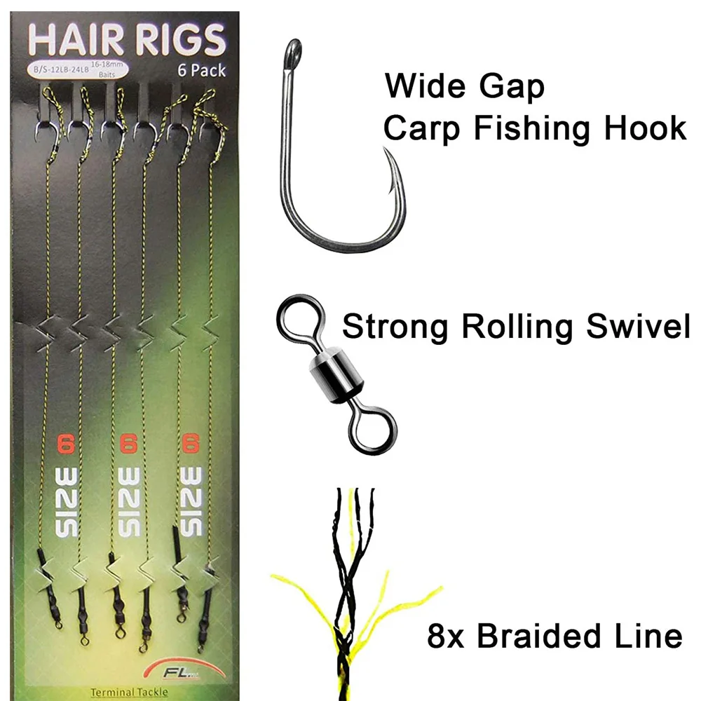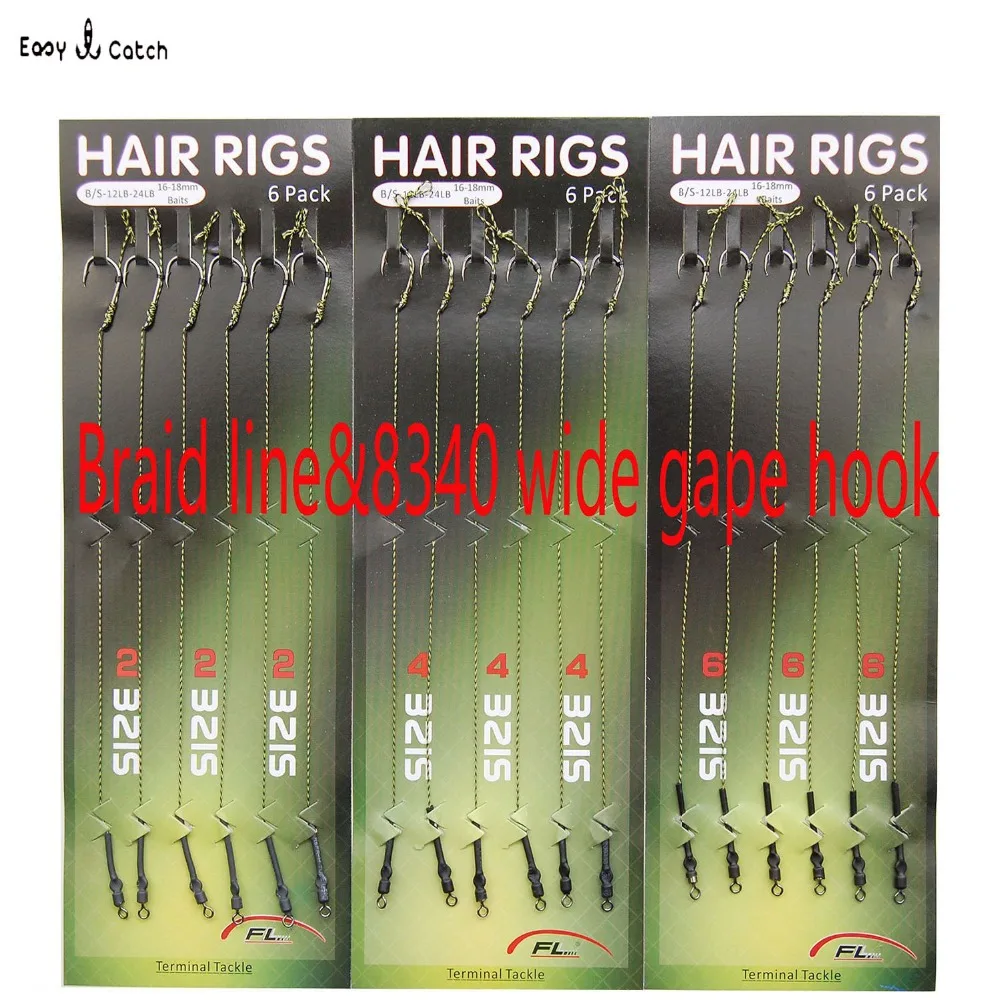 18 piezas=3 paquetes/lote de aparejos de pesca de carpa línea trenzada de camuflaje anchos ganchos de pesca de carpa líder aparejos de pelo tamaño 2 4 6