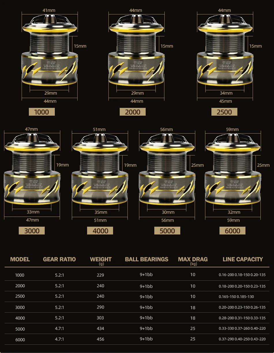 6000 | Relación de engranajes: 4,7: 1 | Peso: 456g | Rodamientos: 9 + 1BB | Arrastre máximo: 25KG | Capacidad del cable: 0,37-290 0,40-250 0,43-220