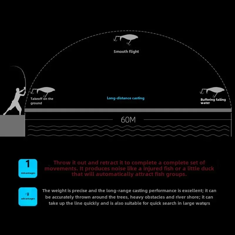 • Nuestro señuelo de pesca está diseñado para un vuelo suave y lanzamientos de larga distancia, lo que le permite alcanzar esos lugares difíciles de alcanzar.La distribución precisa del peso garantiza lanzamientos precisos alrededor de árboles, obstáculos pesados y orillas fluviales.Ocupa rápidamente la línea y es ideal para búsquedas rápidas en aguas grandes.