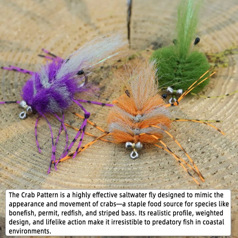 El patrón de cangrejo es una mosca de agua salada altamente efectiva diseñada para imitar la apariencia y el movimiento de los cangrejos: una fuente básica de comida para especies como peces de hueso, permisos, peces enrojeces y lubina rayada.Su perfil realista, diseño ponderado y acción realista lo hacen irresistible para los peces depredadores en entornos costeros.