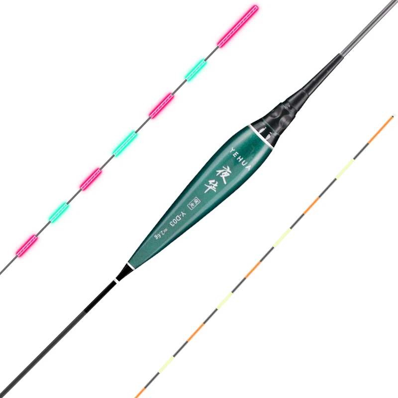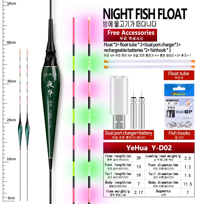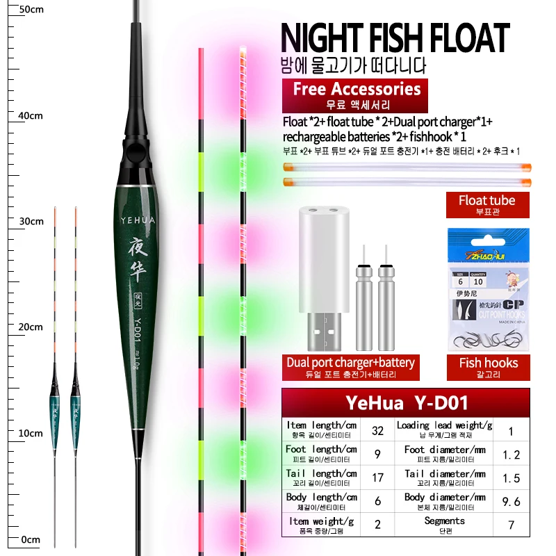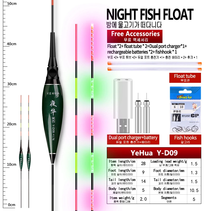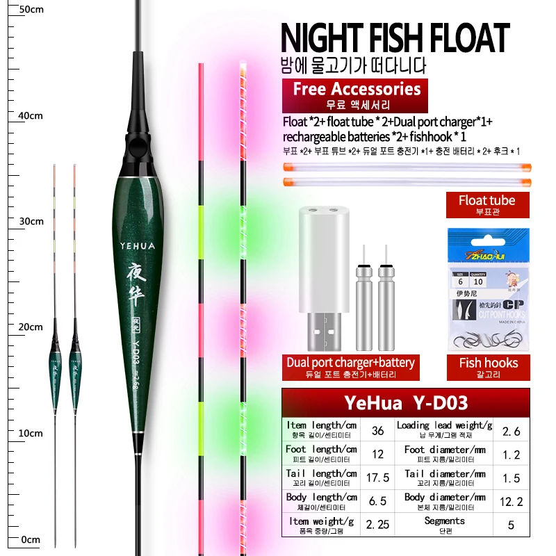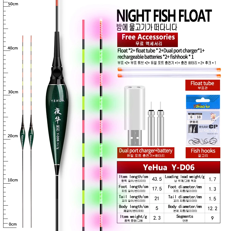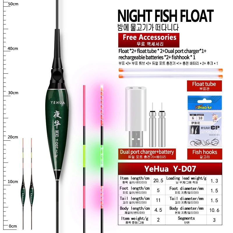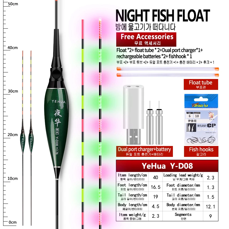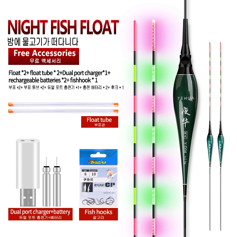 2 Flotadores luminosos de 1 pieza + USB + 2 CR425 recargables + 2 tubos flotantes + 1 bolsa de anzuelos de pesca