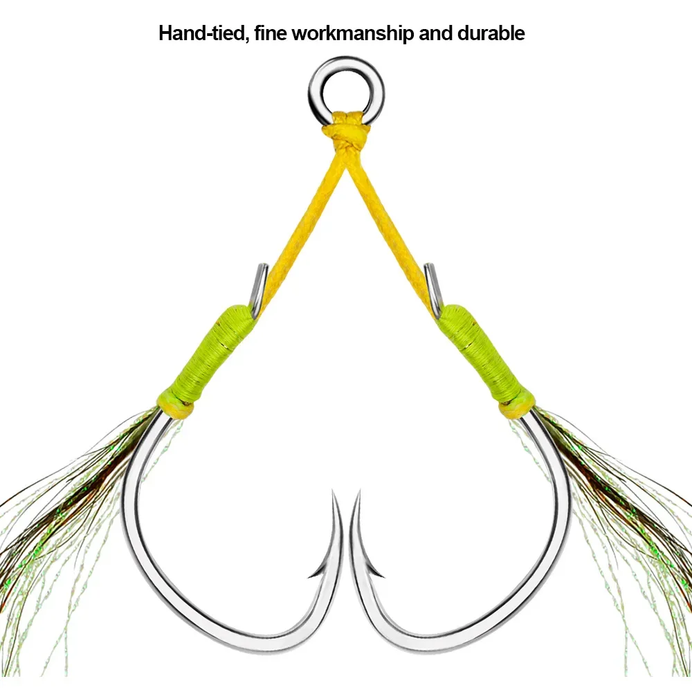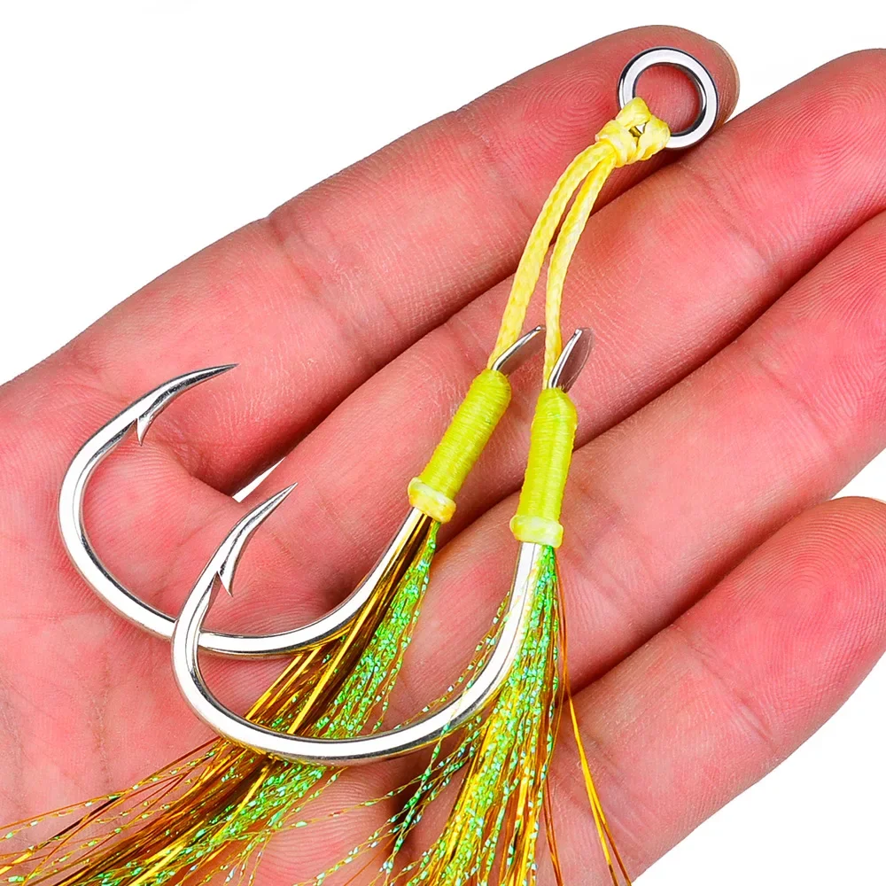 2 par/lote 1/0-5/0 anzuelo de pesca con mosca anzuelo de púas anzuelos dobles afilados con hilo pluma anzuelo de mar aparejos de pesca