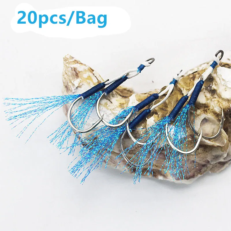 20 par/lote anzuelo de asistencia con plantilla, anzuelos de asistencia con doble púas, acero rico en carbono, pluma azul, señuelo de pesca, anzuelos de Jigging lento