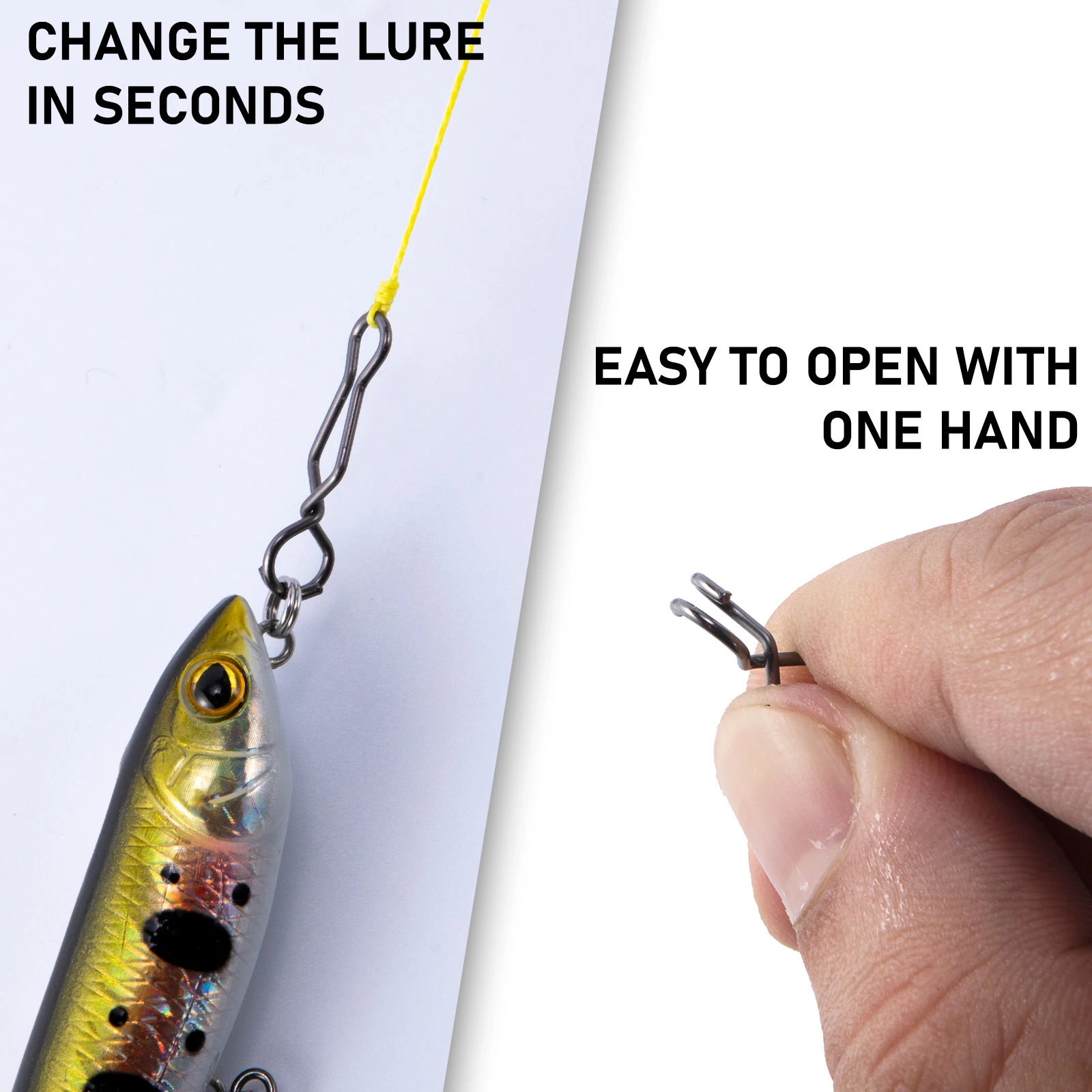 【Cambia señuelos rápidamente】 Con nuestros broches de pesca de fácil apertura y cierre, puedes cambiar los señuelos rápidamente en unos segundos.¡Disfruta de tu maravilloso momento de pesca!