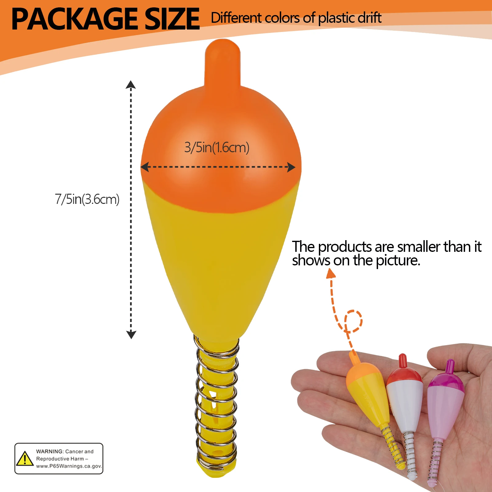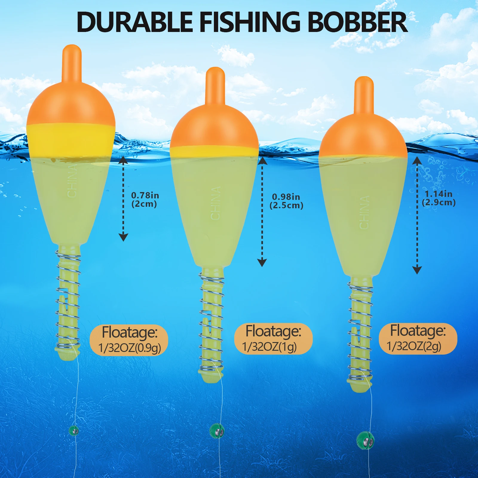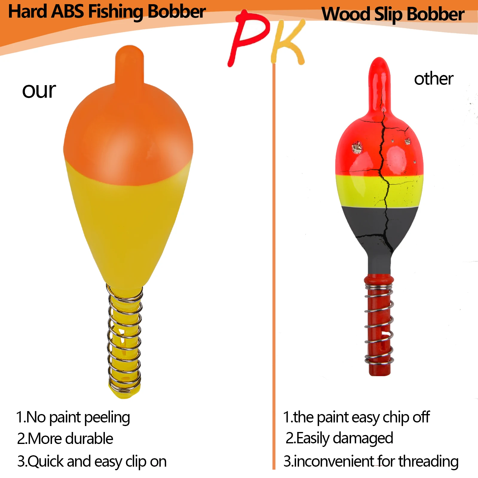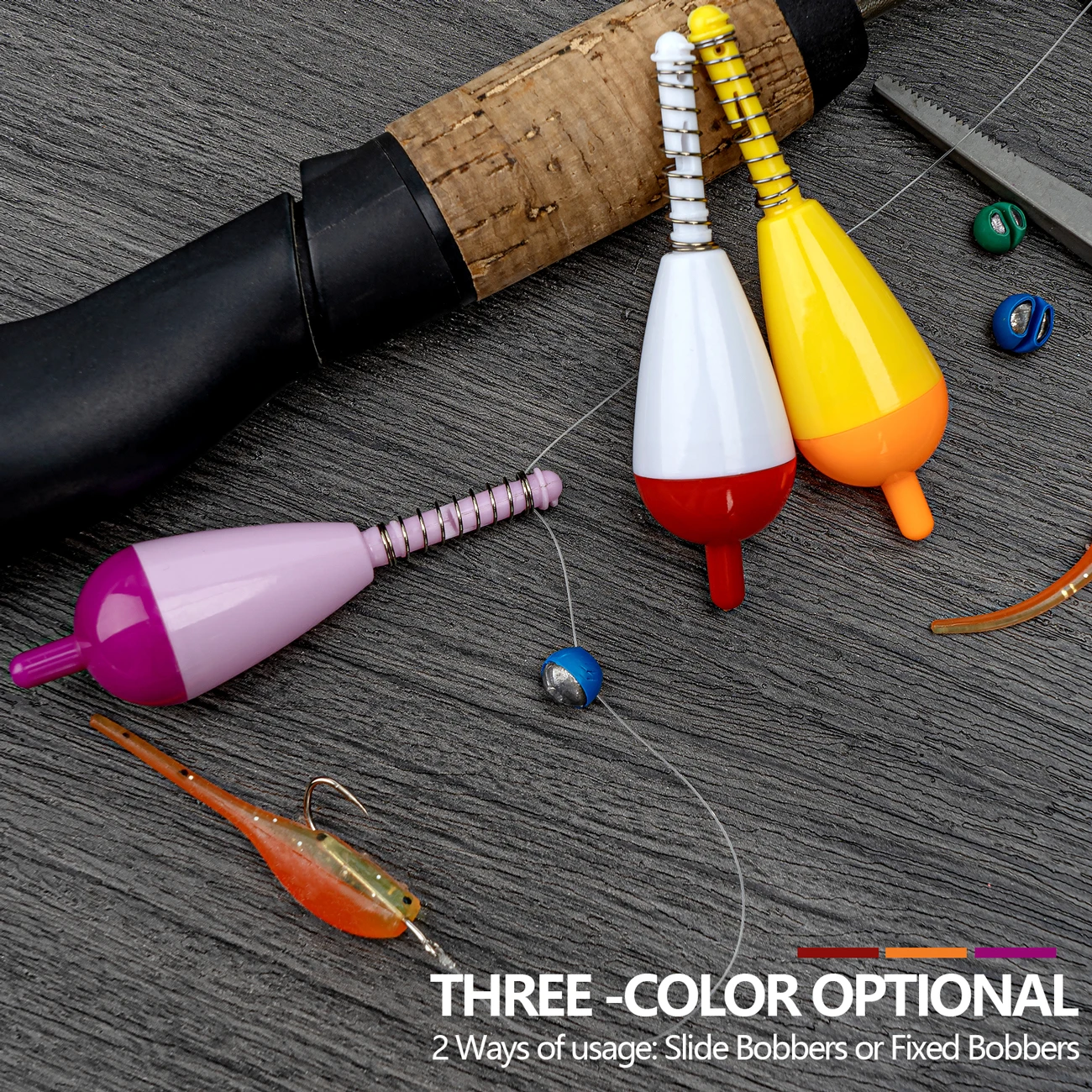 ALTA VISIBILIDAD: Bobbers deslizantes de resorte brillantes con pintura fluorescente de alta visibilidad. Hace que sea más fácil ver cuando los peces muerden el cebo. Perfecto para crappie, panfish, walley, lubina, trucha, etc.