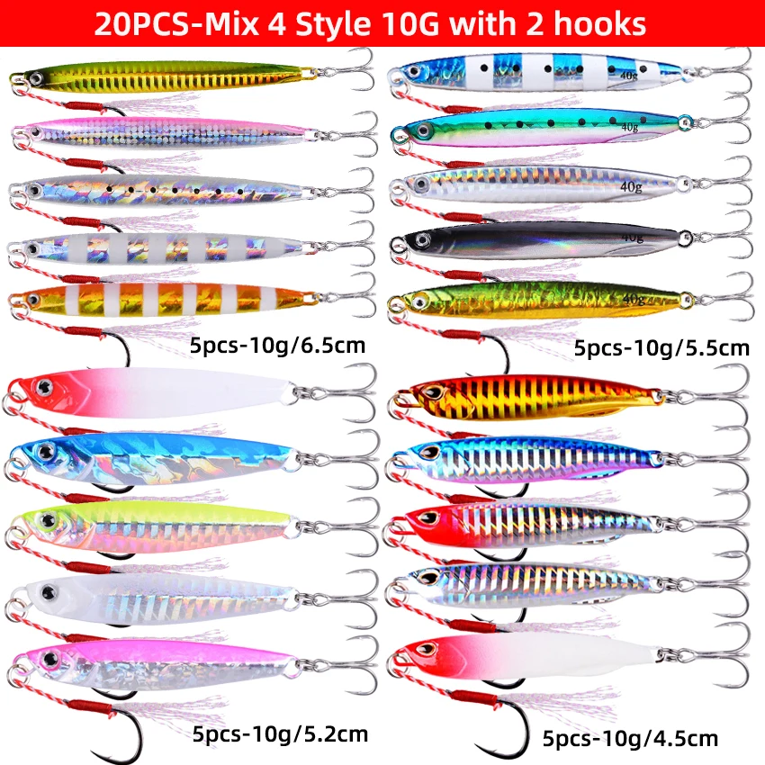 20 piezas juego de plantilla de Metal fundido, cuchara 10G 20G 30G 40G 60G Shore Casting Jigging Fish Sea Bass, señuelo de pesca, aparejos de cebo Artificial