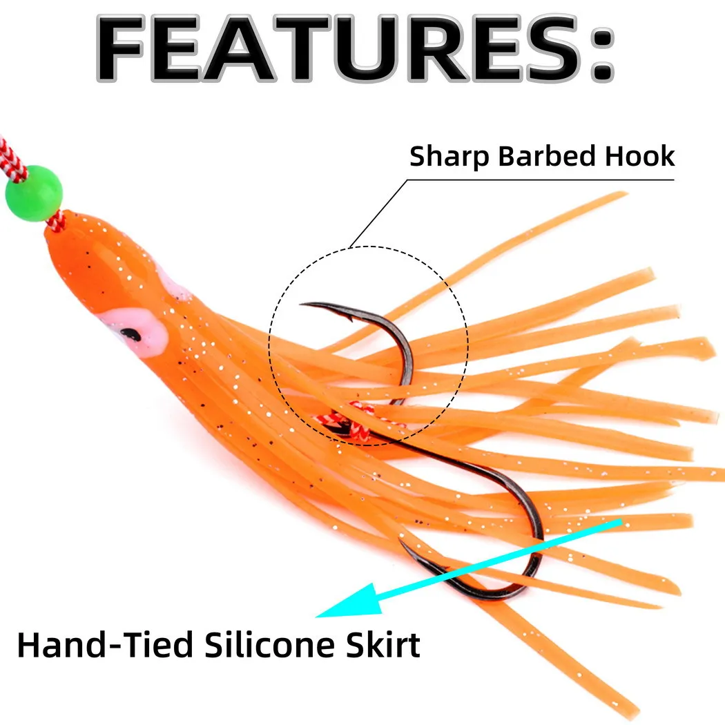 Aparejos de cebo de pesca blandos con anzuelos de alto carbono, 10 paquetes de señuelos de pesca de pulpo, 5 ganchos/paquete, gancho de cuerda de agua salada, cuentas luminosas