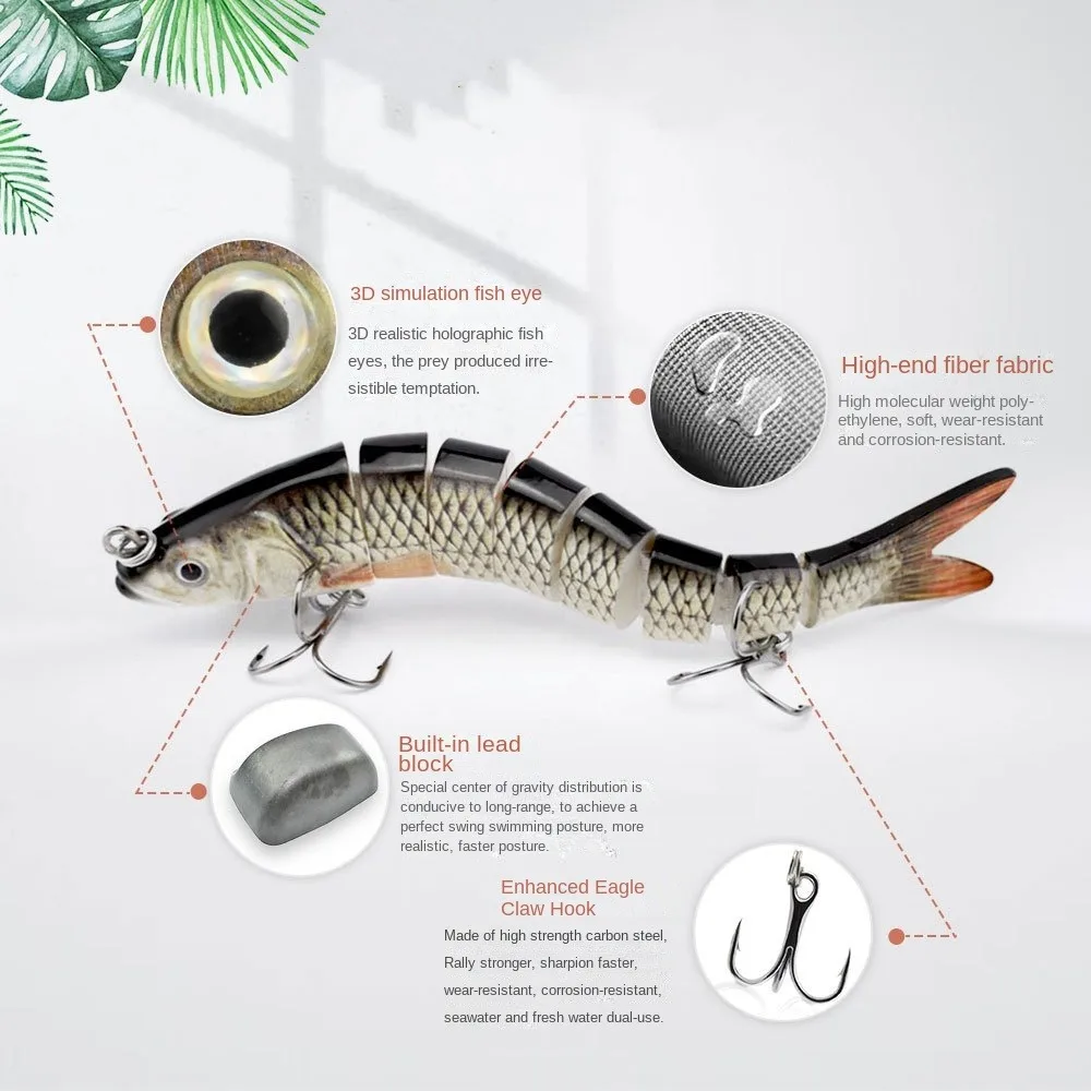Adopting a new coating, it has a good fishing lure effect, strong pulling force, realistic and vivid swimming posture, suitable for different water conditions, 3D simulation eyes, black nickel hooks (corrosion-resistant, more suitable for sea fishing) sharp and durable, professional fishing bait, making your fishing moments dazzling. Package Included: