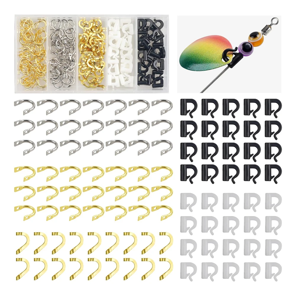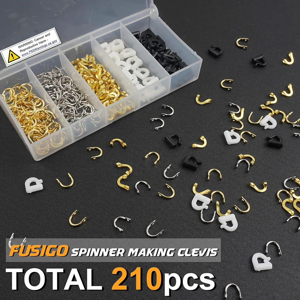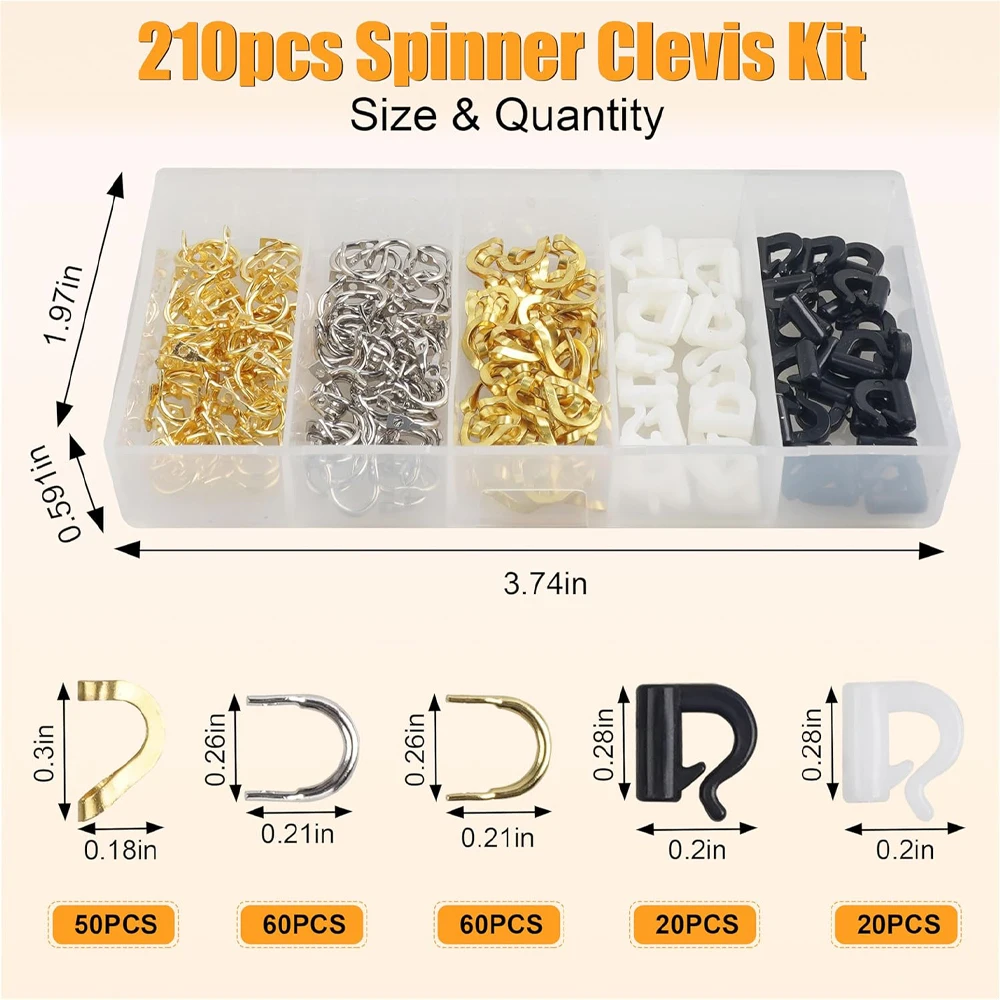 1. 210pcs Fishing spinner clevis kit include 5 kinds of fishing clevis,50pcs- brass folded clevis,60pcs-gold spinner clevis,60pcs-silver spinner clevis,20pcs-black plastic fishing clevis,20pcs-white plastic fishing clevis. Enough quantity and different colors for most kinds of spinner blades.