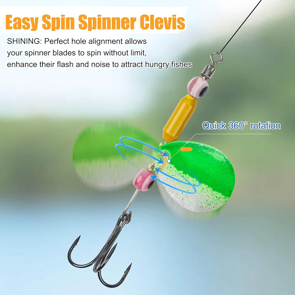 3. Spinner clevises are perfect for add on lures, blades, spoons. Simple to build your own spinners like crawler harness, inline spinners, walleye spinners rigs, spinnerbaits, salmon trout spinners etc. Spinner blade clevis is a simple part for lure making.