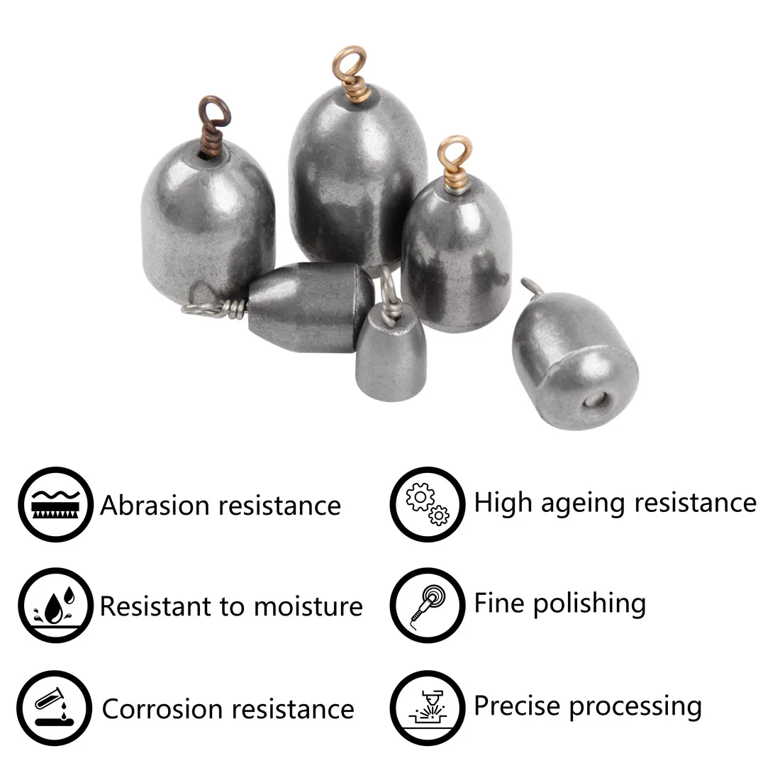 1.La forma de gota de agua de las plomos de pesas de pesca reduce la resistencia que cae al agua, una velocidad de hundimiento rápida y en el fondo del agua puede evitar obstáculos de manera efectiva.