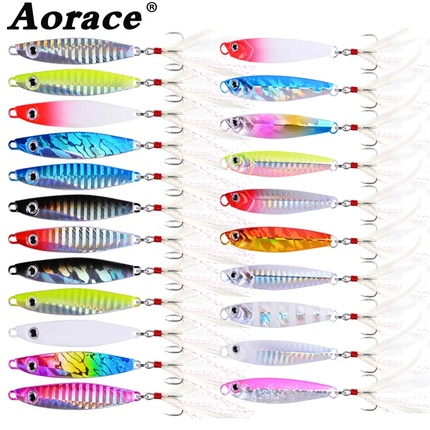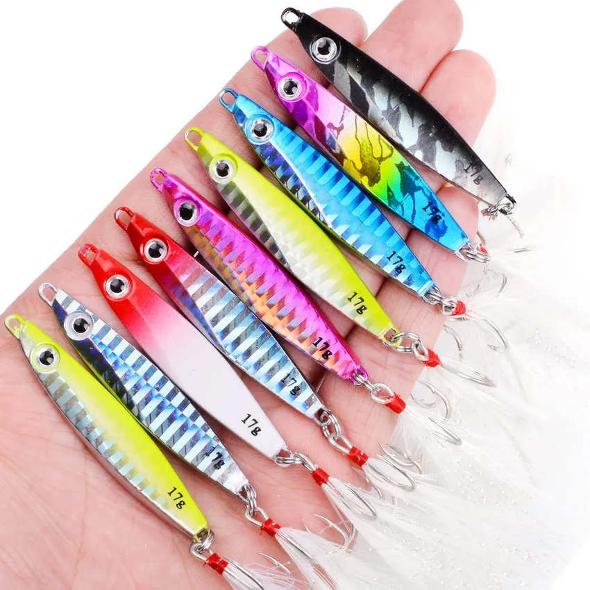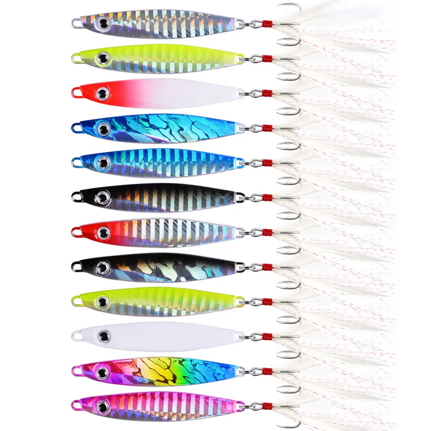 22 Uds Micro Metal fundido Jig cuchara señuelo cebo Artificial Shore lento Jigging Señuelos de Pesca con anzuelo de plumas accesorios de pesca