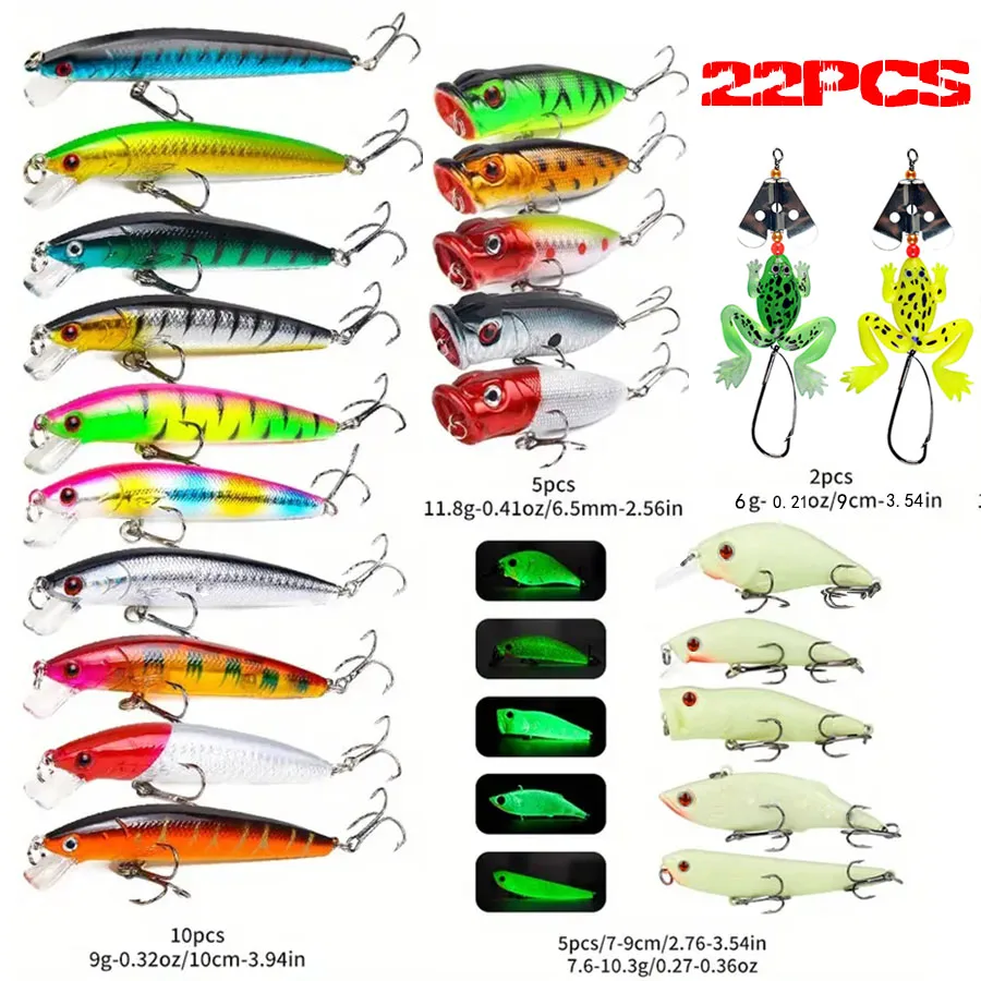 22 unids/caja Kit de señuelos de pesca Wobblers para lubina Walleye trucha carpa Minnow lápiz luminoso Vib y rana suave Swimbait juego de cebo duro