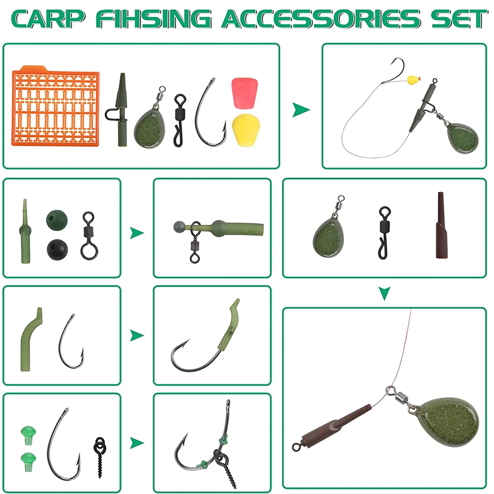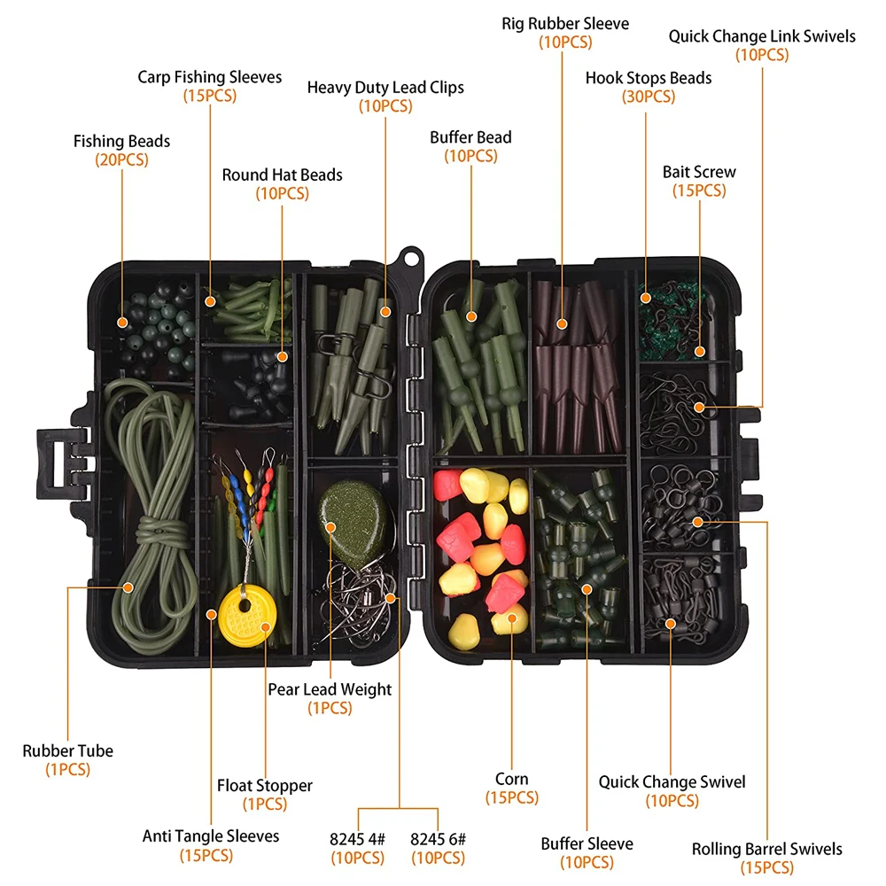 1.Caja de aparejos de pesca de carpa, incluye fundas antienredos, anzuelos de carpa, giratorios de cambio rápido, tornillos de cebo, tubo de aparejo para correr, peso para pescar carpas, etc.