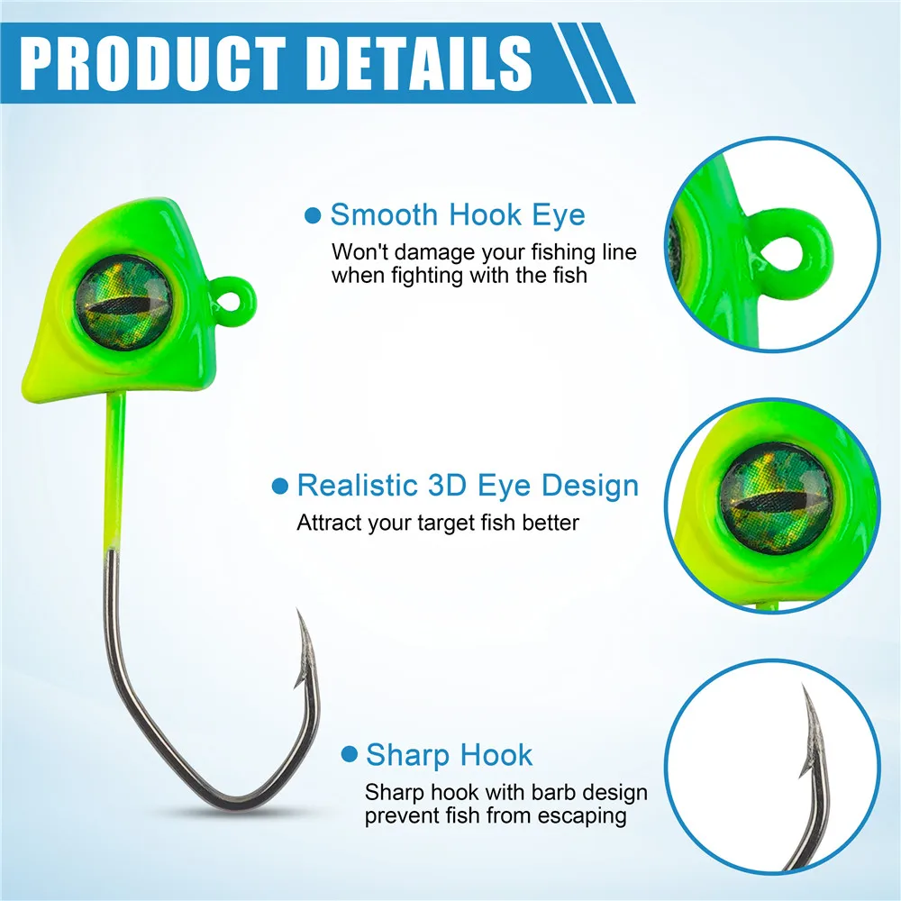 3.Cabezales de plantilla triangulares con grandes ojos 3D y colores brillantes, acción de natación vívida, hacen que sus señuelos sean reales en el agua y atraigan mejor a los peces grandes.Gran regalo para Halloween y Navidad.