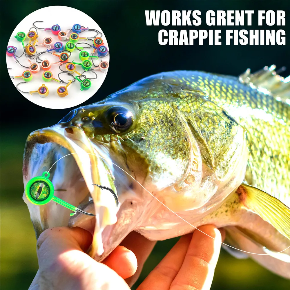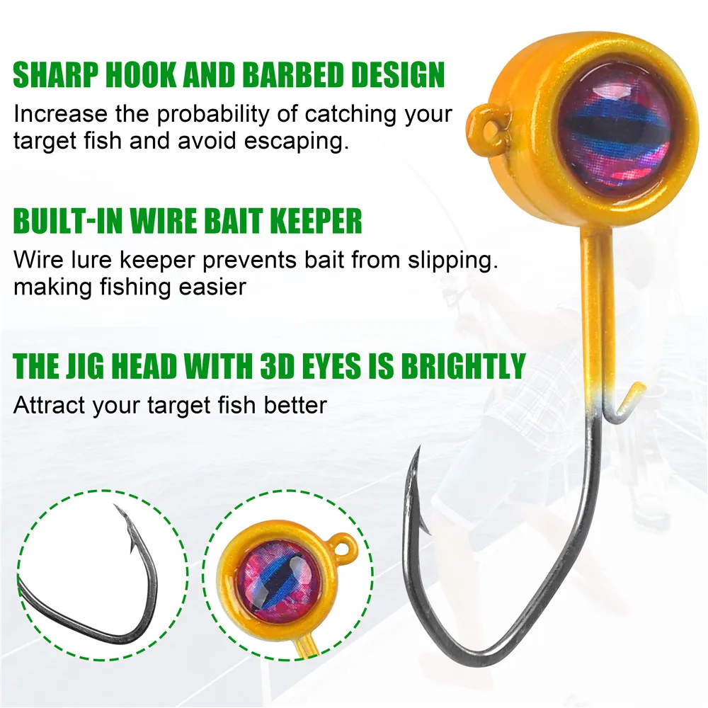 3.Jig Heads con grandes ojos 3D y colores brillantes y vibrantes, acción de natación vívida, hacen que sus señuelos sean reales en el agua y atraigan mejor sus peces.Gran regalo para Halloween y Navidad.