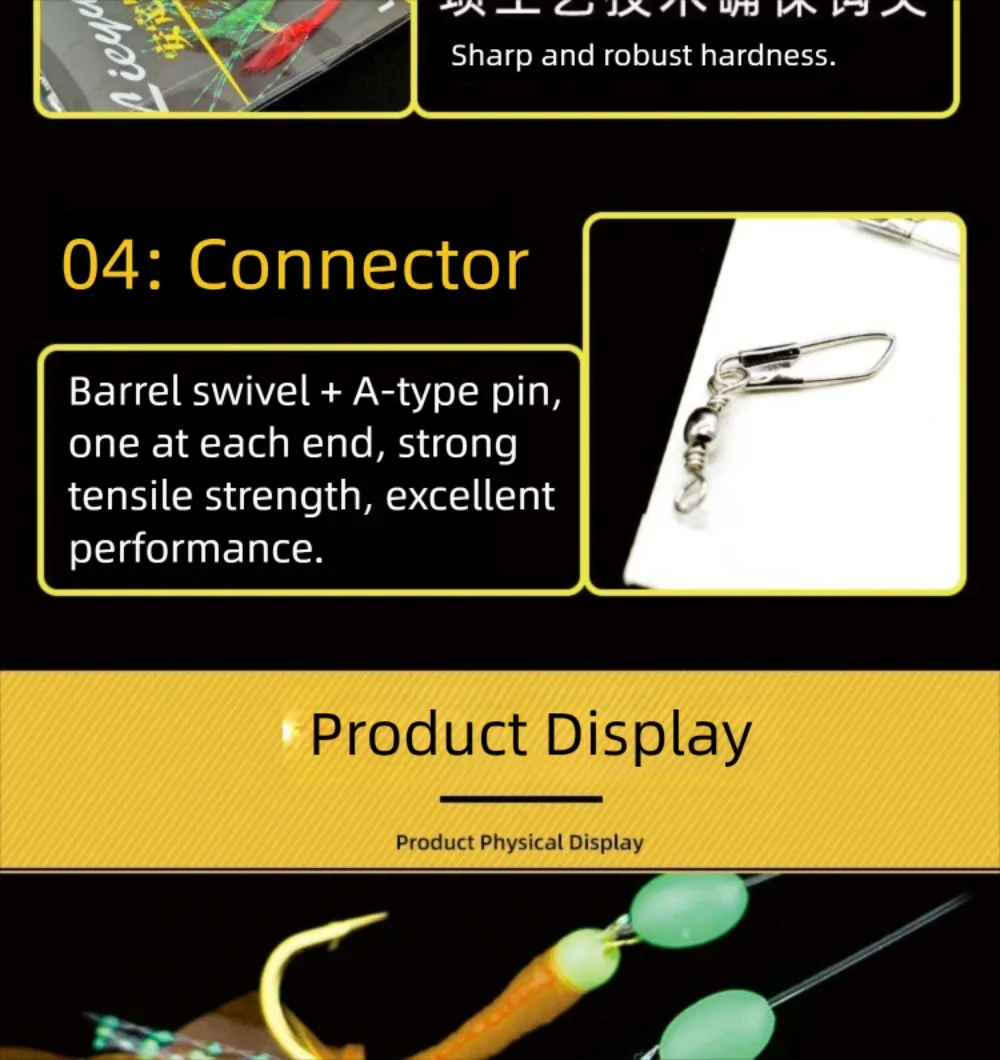 5.Duradero y confiable: construido con materiales duraderos, este aparejo está diseñado para soportar los rigores de la pesca.Puede soportar fuertes tirones y condiciones difíciles, lo que garantiza que los ganchos permanezcan sujetos de forma segura al equipo.Esta durabilidad y confiabilidad minimizan el riesgo de perder su captura.