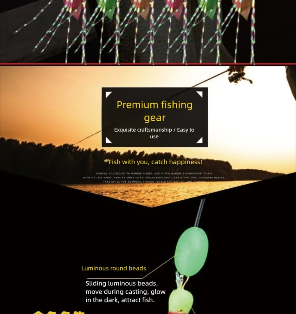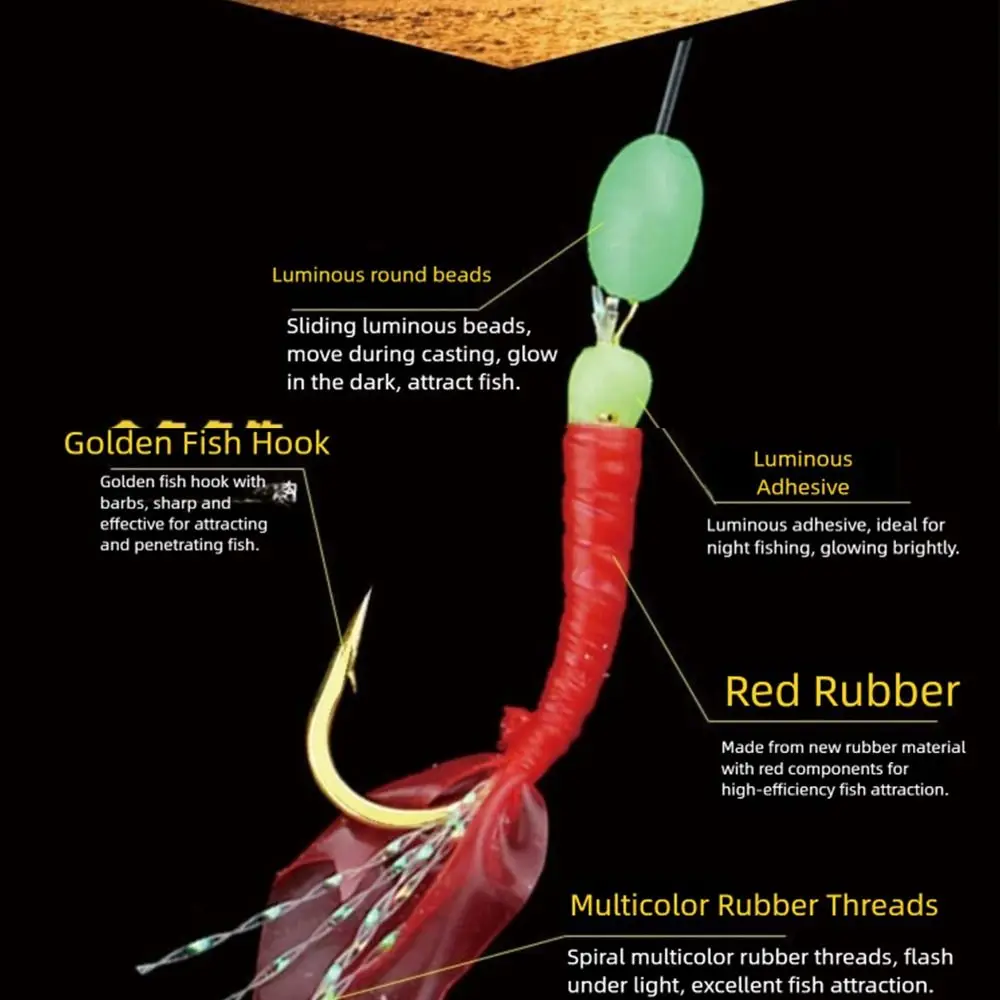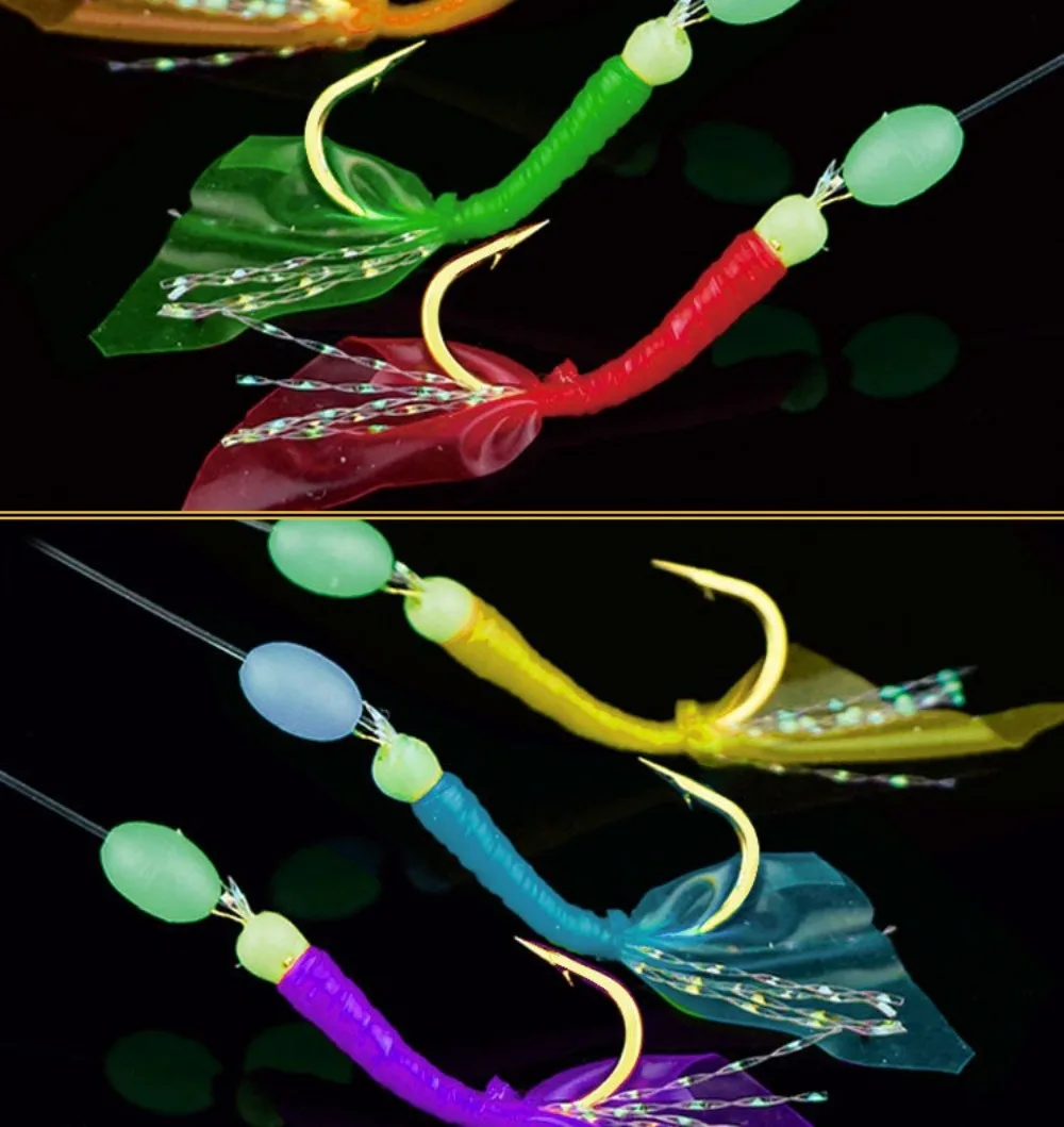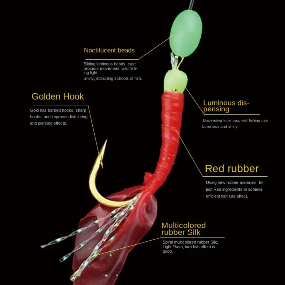 3. Luminous Bean Lure Bait: Each hook on the rig is adorned with a luminous bean lure bait. The luminous feature makes the bait highly visible underwater, even in low-light conditions. It effectively attracts fish and enhances your chances of enticing them to bite.