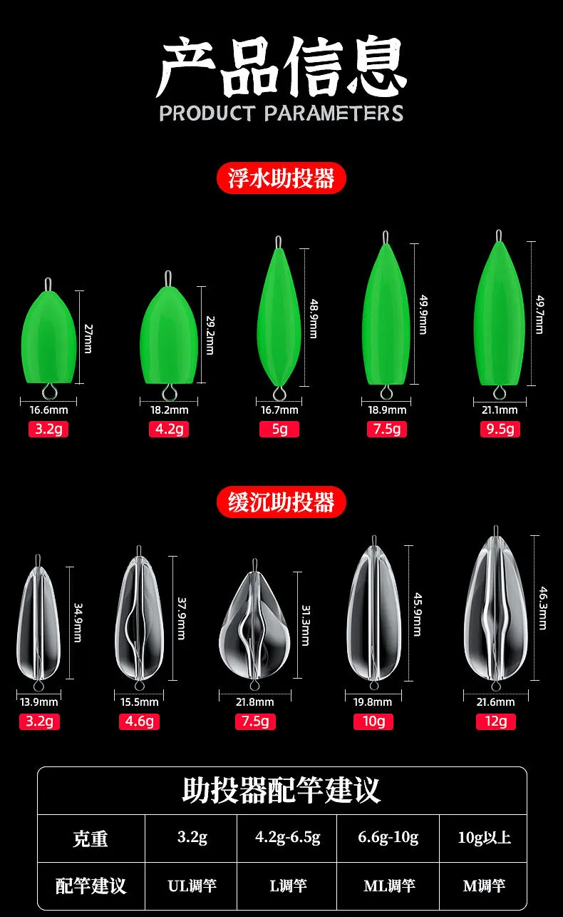 3,2g 4,2g 4,6g 5g 7,5g 10g 12g peso de fundición verde noctilucente flotante en agua, hundimiento transparente lentamente