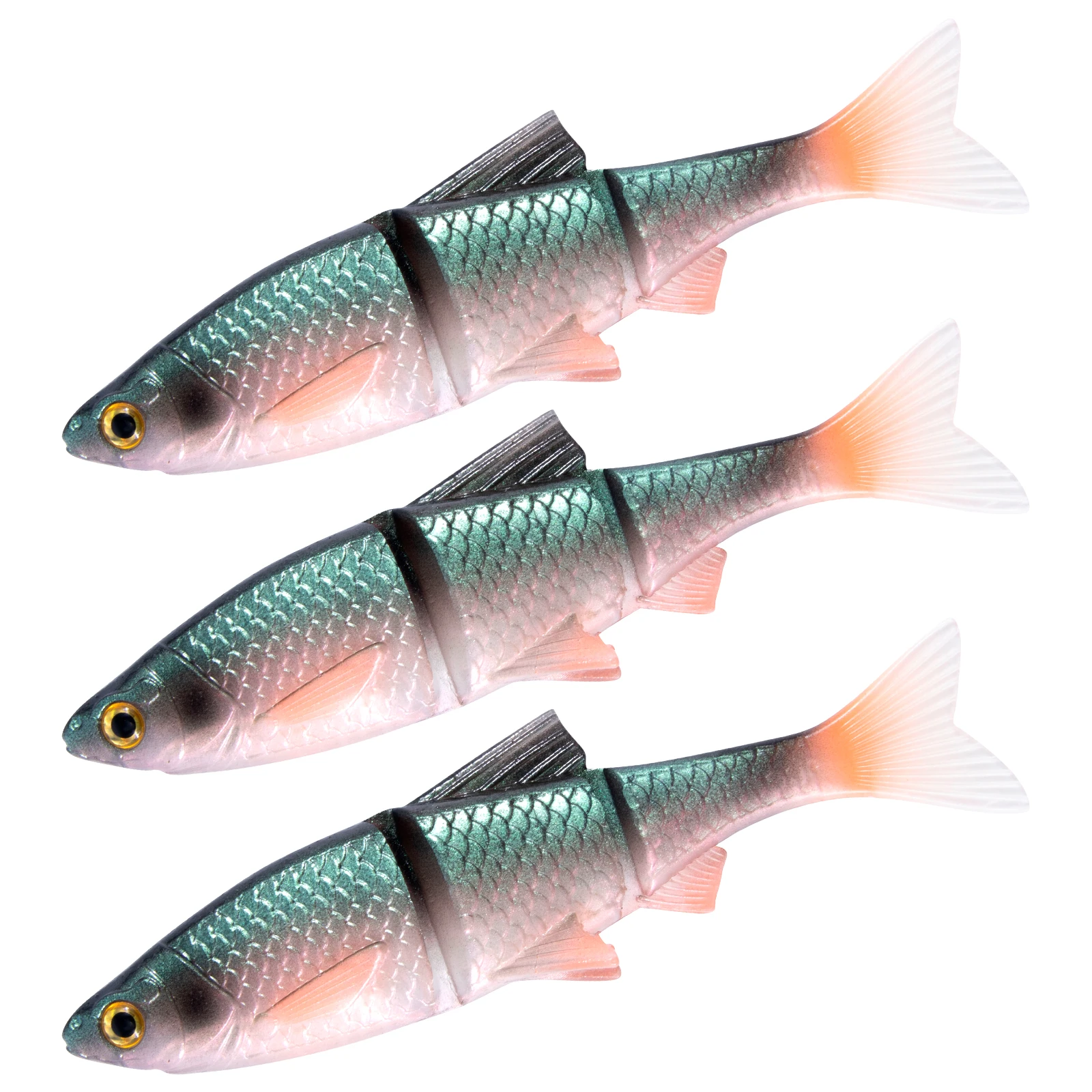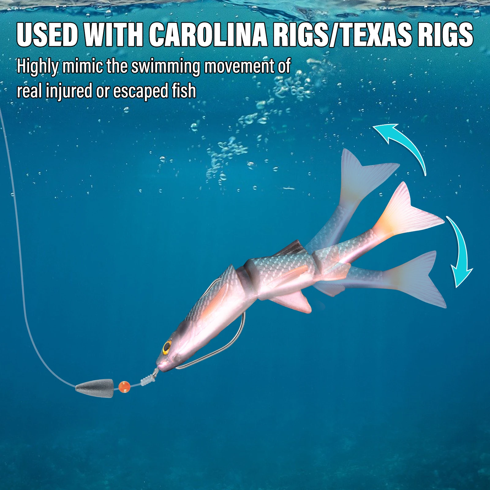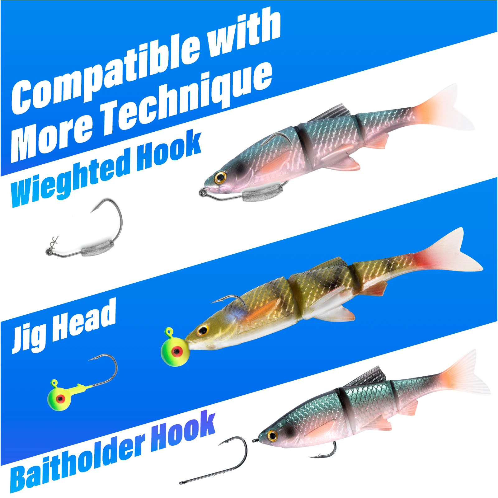 AMPLIA APLICACIÓN: Estos cebos de plástico blando se pueden utilizar para capturar una variedad de peces, incluidos lubina, lucioperca, lucio y trucha.Este swimbait es muy adecuado tanto para agua salada como para agua dulce y funciona bien en todas las capas de agua.También se puede utilizar con Carolina Rigs, Texas Rigs y Drop Shot Rigs.