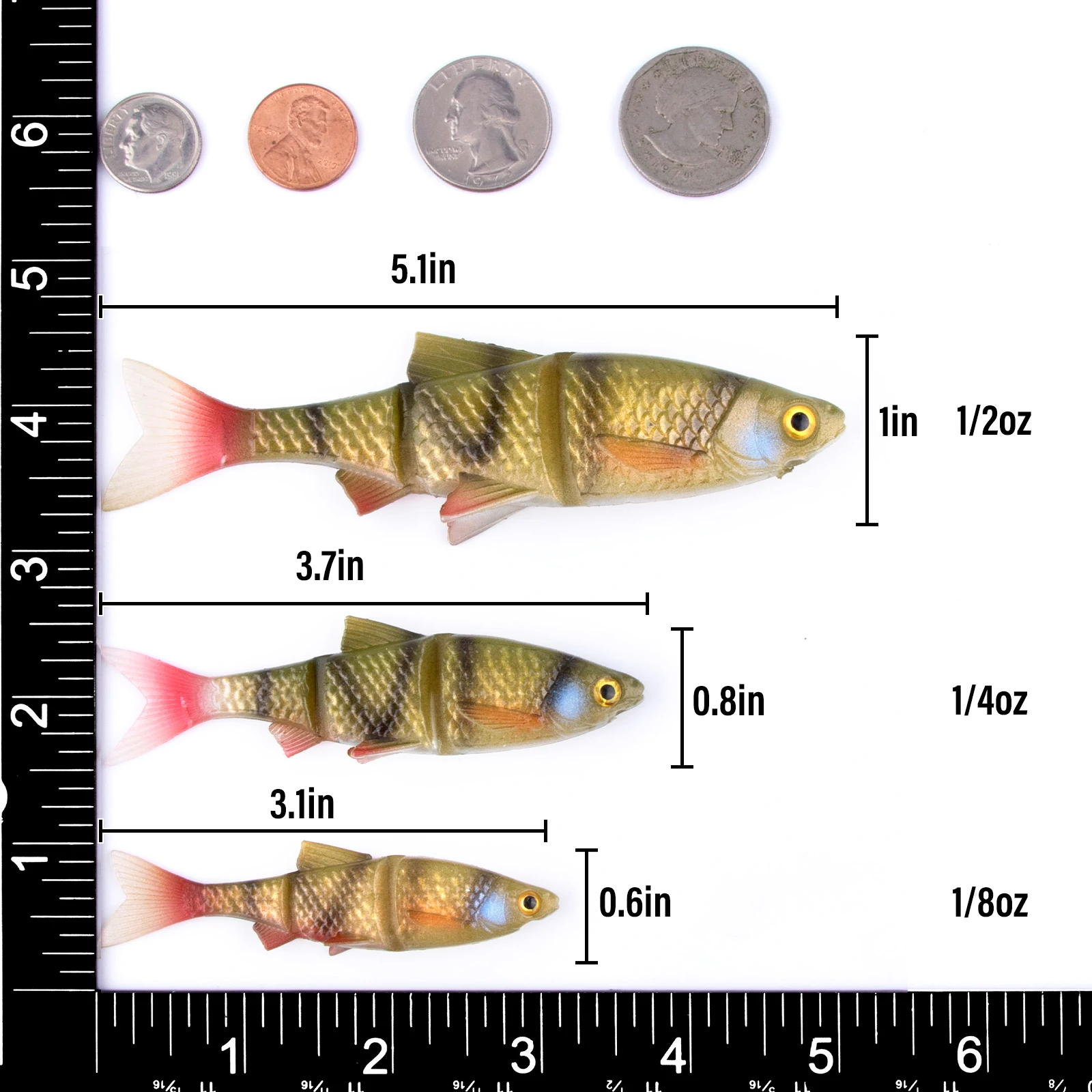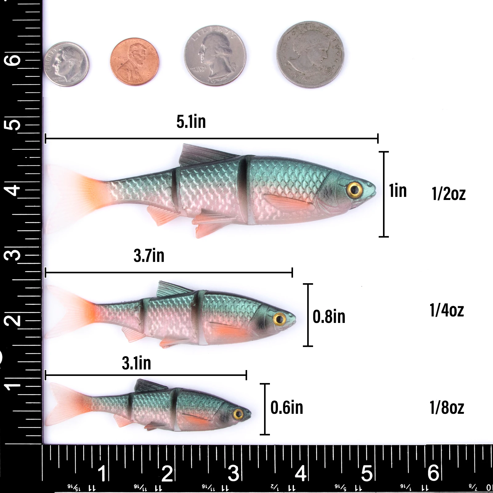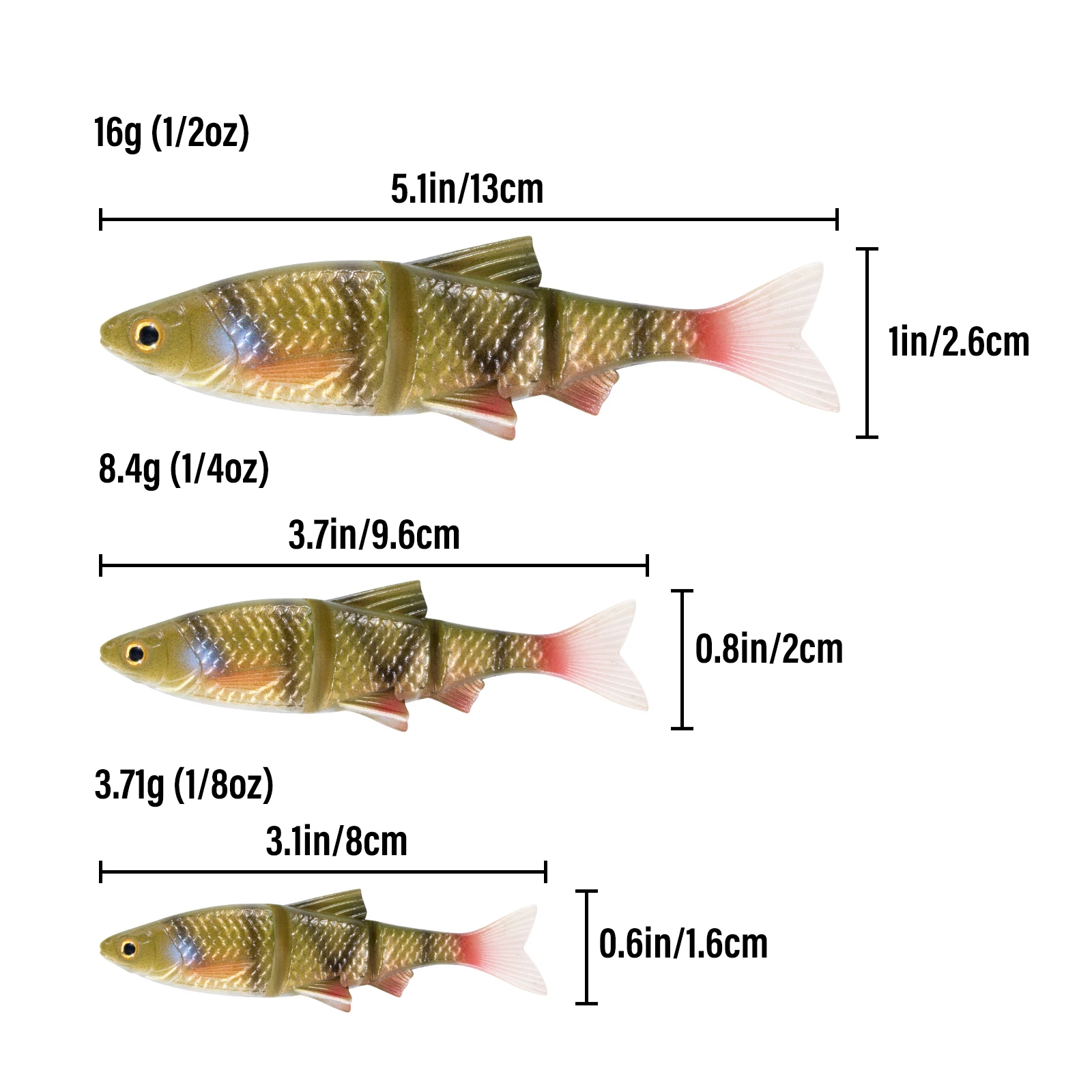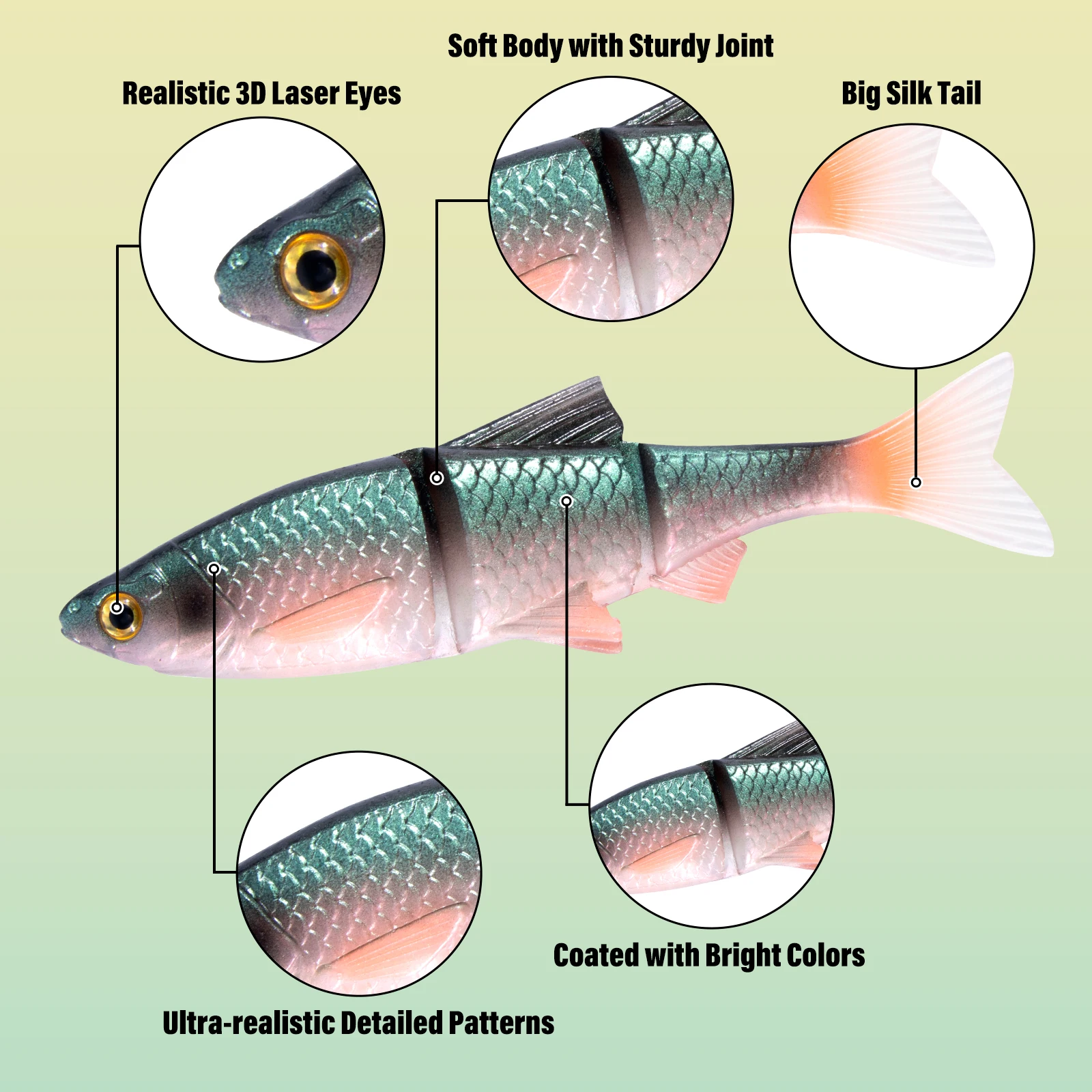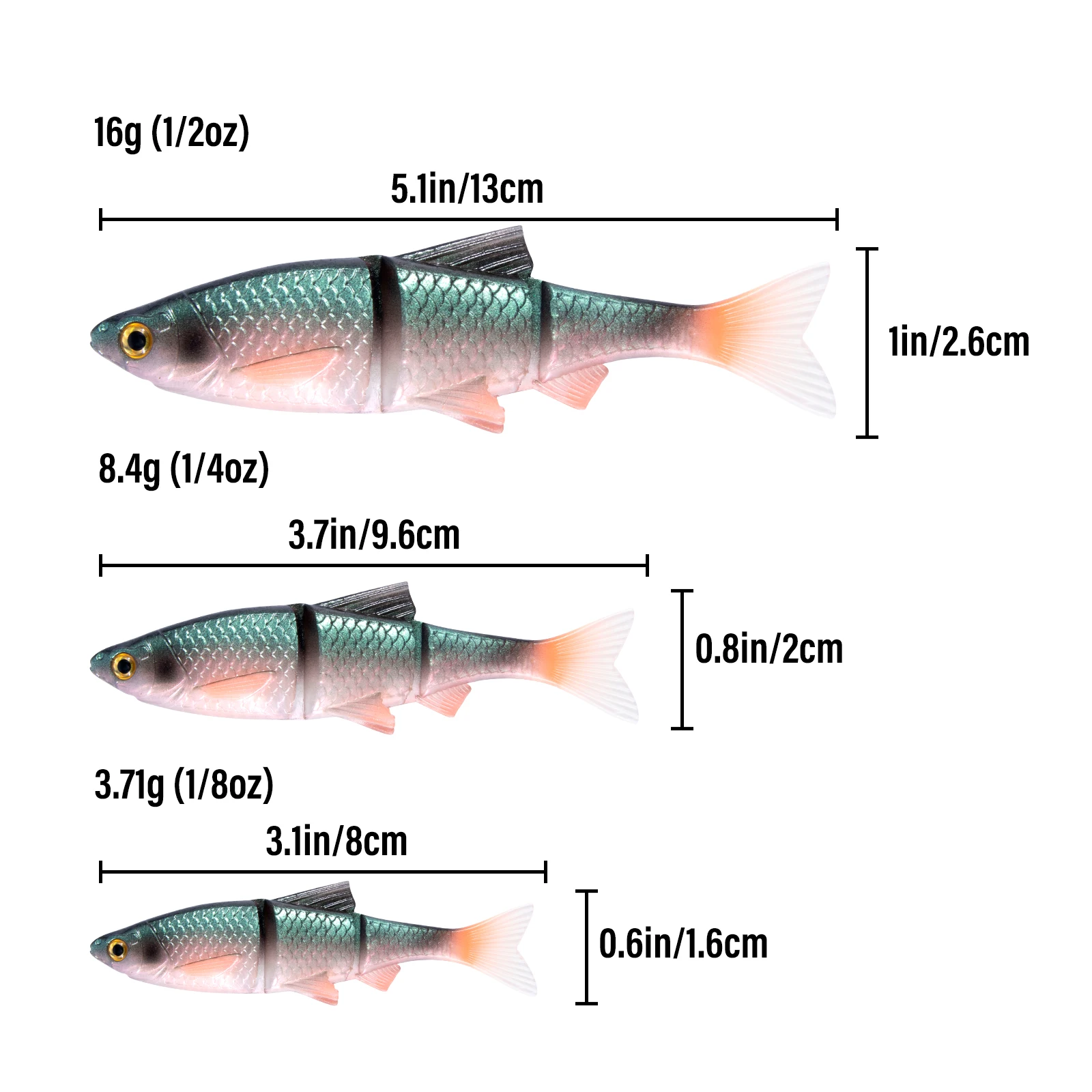 MATERIAL PREMIUM: Nuestros swimbaits están hechos de material de PVC de alta calidad, que puede soportar condiciones duras y múltiples picaduras feroz de presa.La superficie está cubierta con grasa natural para maximizar visualmente la reproducción de peces reales.Durable y no se deforma fácilmente.