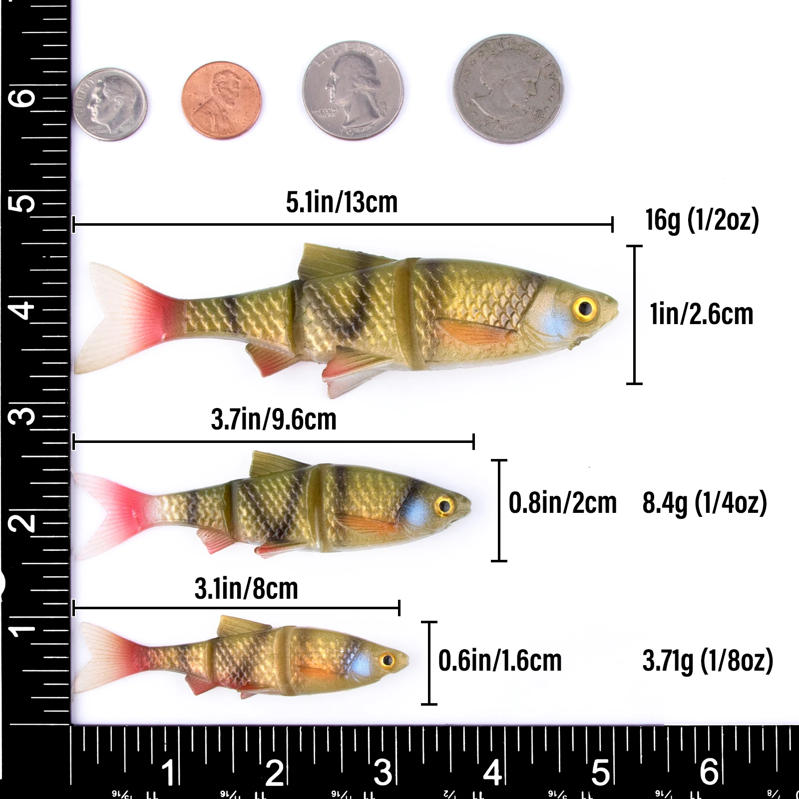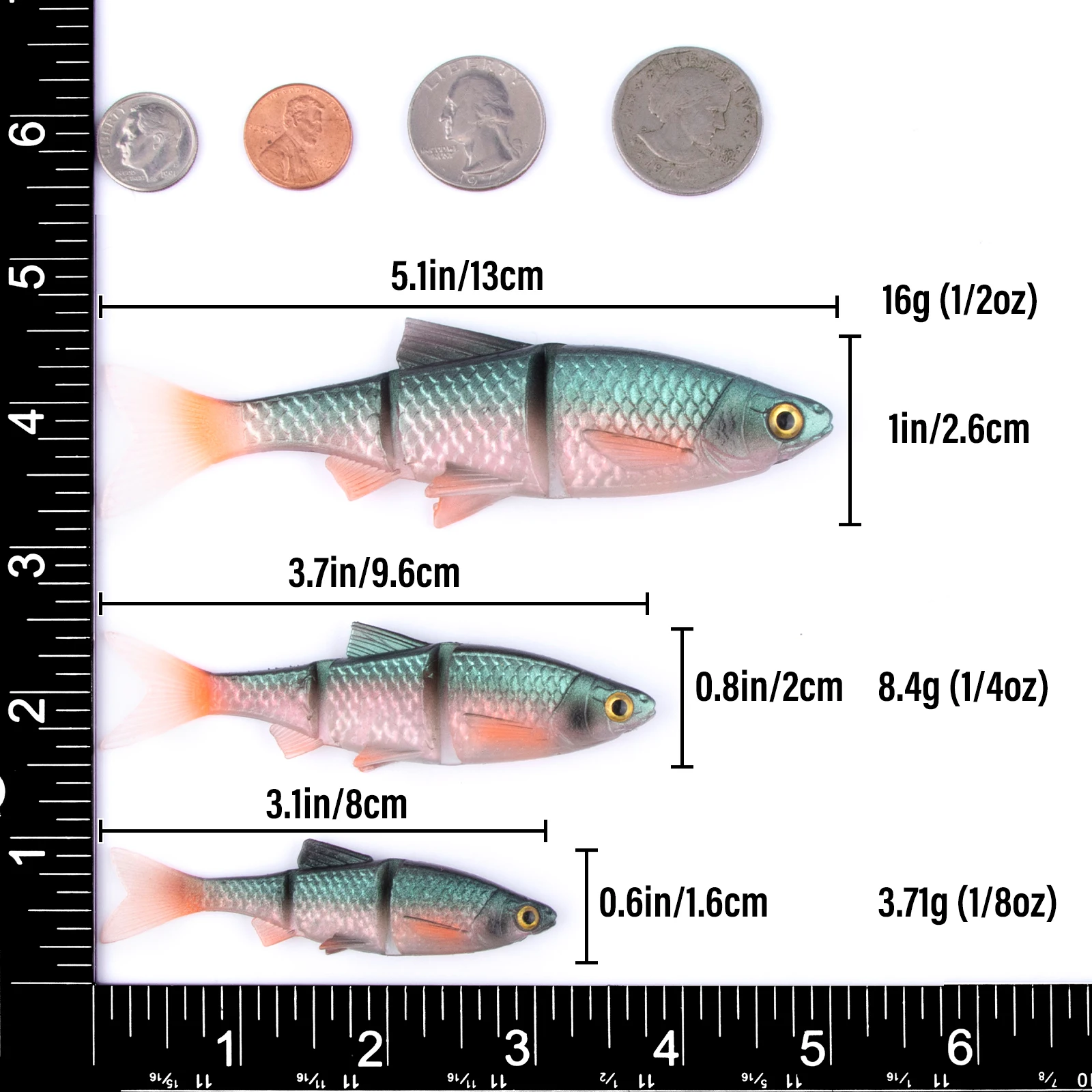 ESPECIFICACIONES DEL PRODUCTO: Tres especificaciones para elegir: 2PCS TAMAÑO GRANDE, 3PCS TAMAÑO MEDIO, 4PCS TAMAÑO PEQUEÑO Swimbaits de plástico blando. Hay tres colores disponibles para que elijas. Longitudes: 5,12 pulgadas/13 cm (grande), 3,78 pulgadas/9,6 cm (medio), 3,15 pulgadas/8 cm (pequeño).