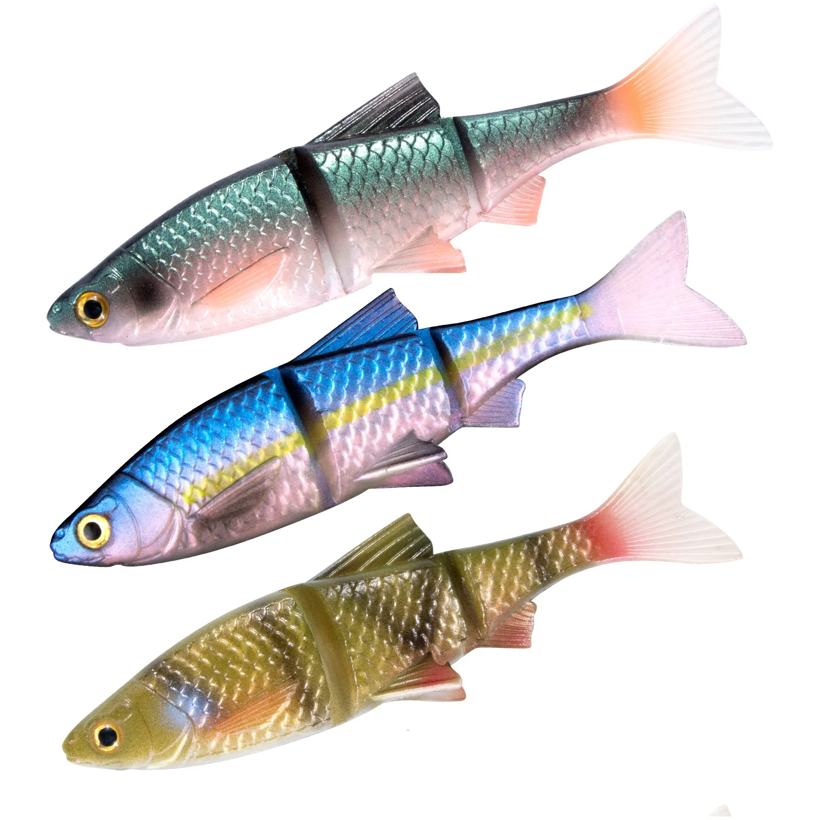 APARIENCIA REALISTA: Imita la apariencia de un pez real, con un cuerpo suave y elástico.La superficie de los cebos de natación está recubierta con un acabado colorido, con patrones ultrarrealistas y ojos 3D que se reflejan mientras nada, brindando una presentación incomparable.