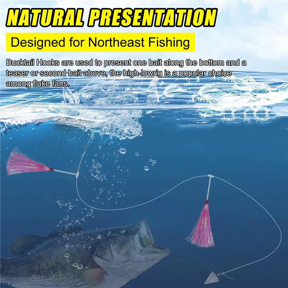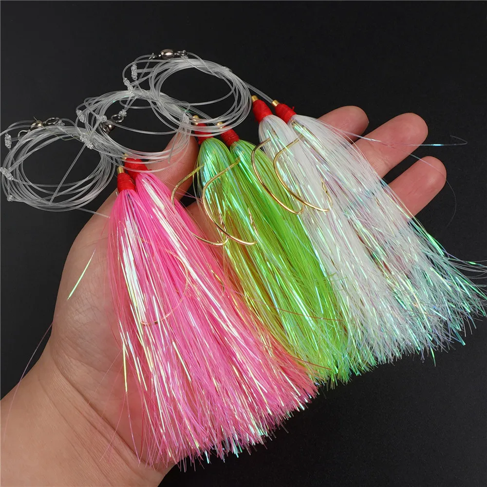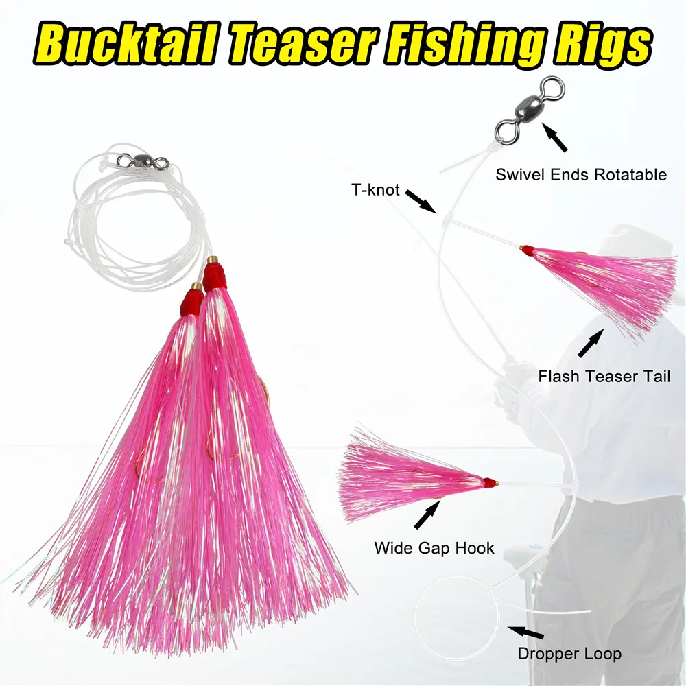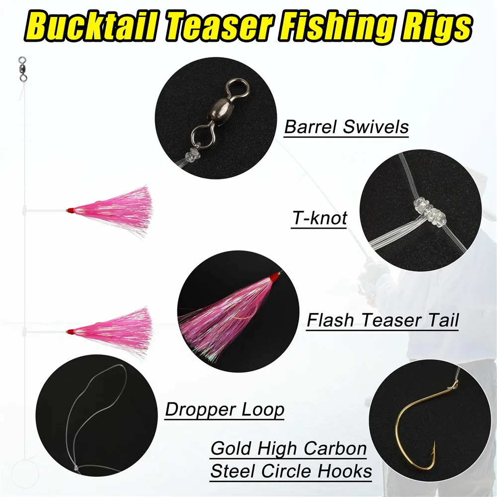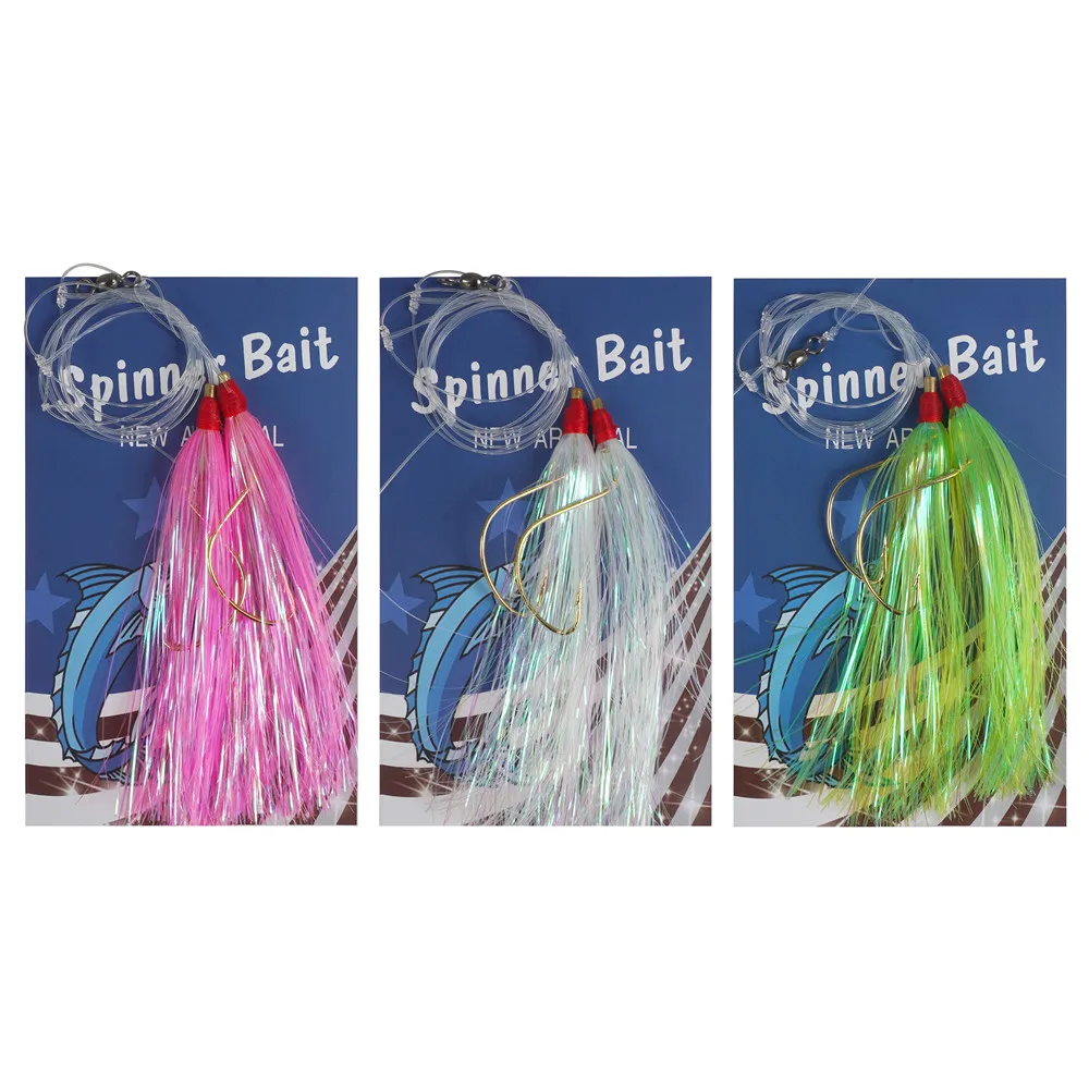 1. Anzuelos de pulpo de espacio ancho compensado con MYLAR BUCKTAIL preatados en un líder mono de 30lb con plataformas giratorias de 60lb, plataformas de cebo de cola alta-baja.