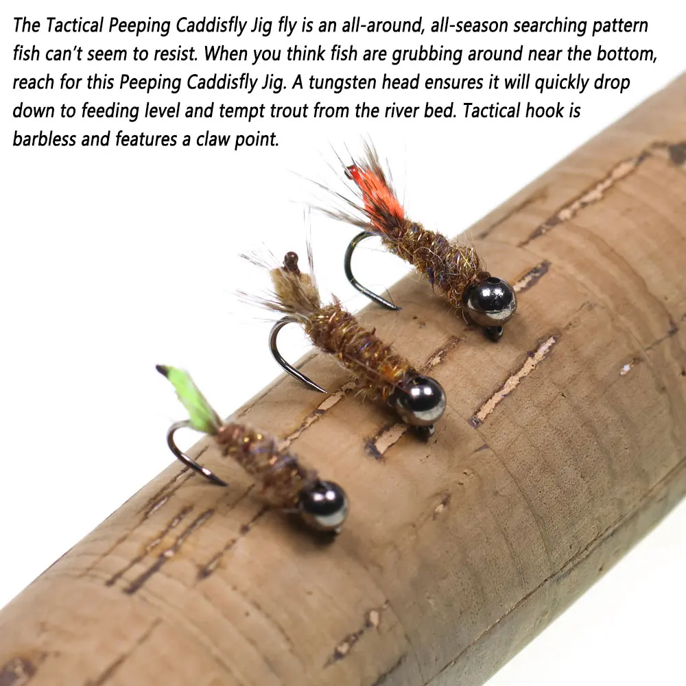 La mosca táctica Peeping Caddisfly Jig es un pez con patrón que busca durante todas las estaciones que no parece resistirse.Cuando cree que los peces están larguando cerca del fondo, alcance esta plantilla Peeping Caddisfly.Una cabeza de tungsteno garantiza que se caiga rápidamente al nivel de alimentación y a la tentadora de la trucha del lecho del río.El gancho táctico no tiene púas y cuenta con una punta de garra.