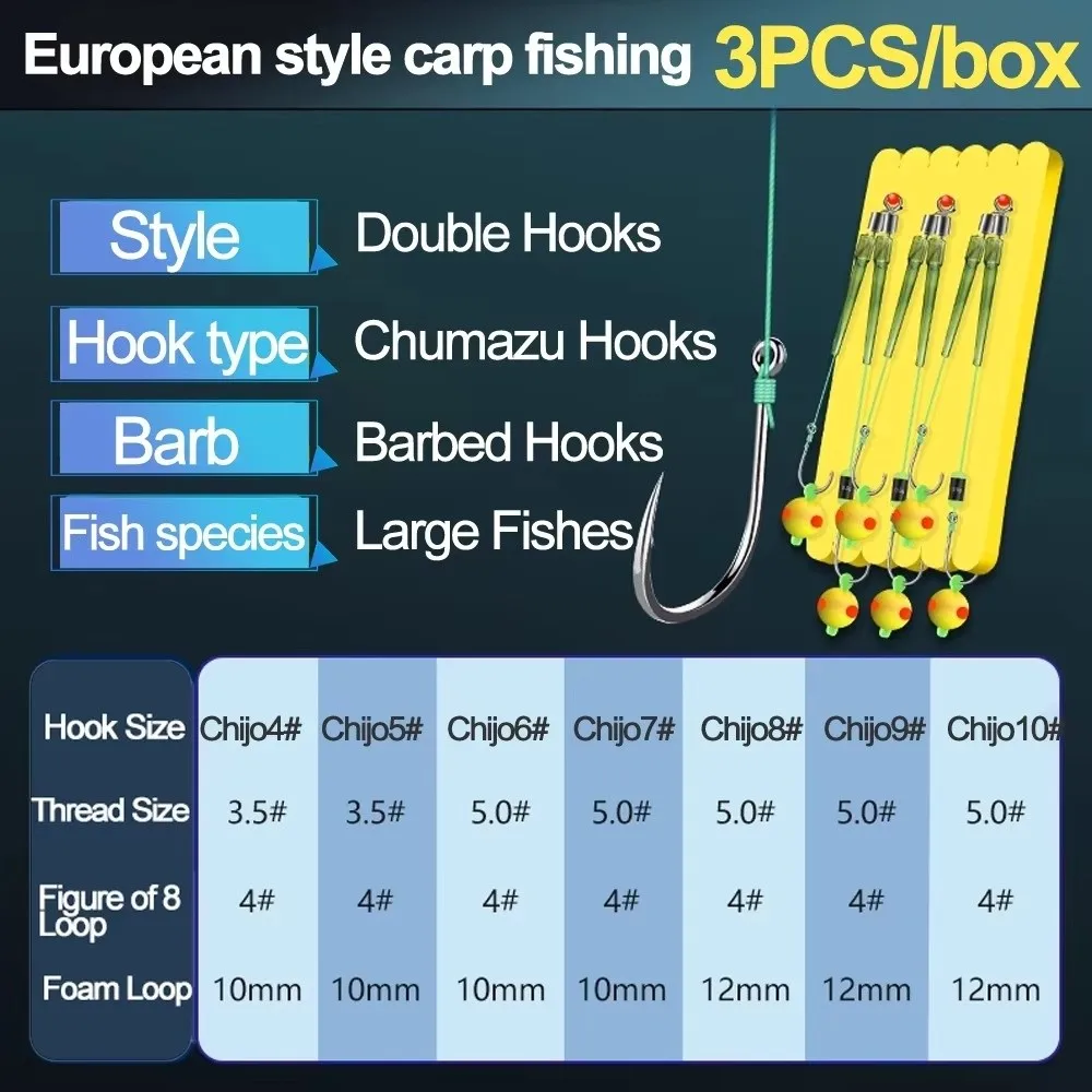 1.Structural design: The double hook line set adopts the European carp fishing anti-bottom design, equipped with Chiyo hooks, which can effectively prevent bottom hanging, and is suitable for float fishing and other fishing methods, optimizing the efficiency of catching fish and the stability of the fishing set.