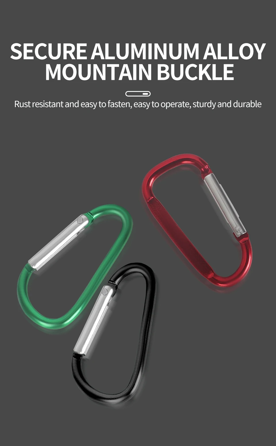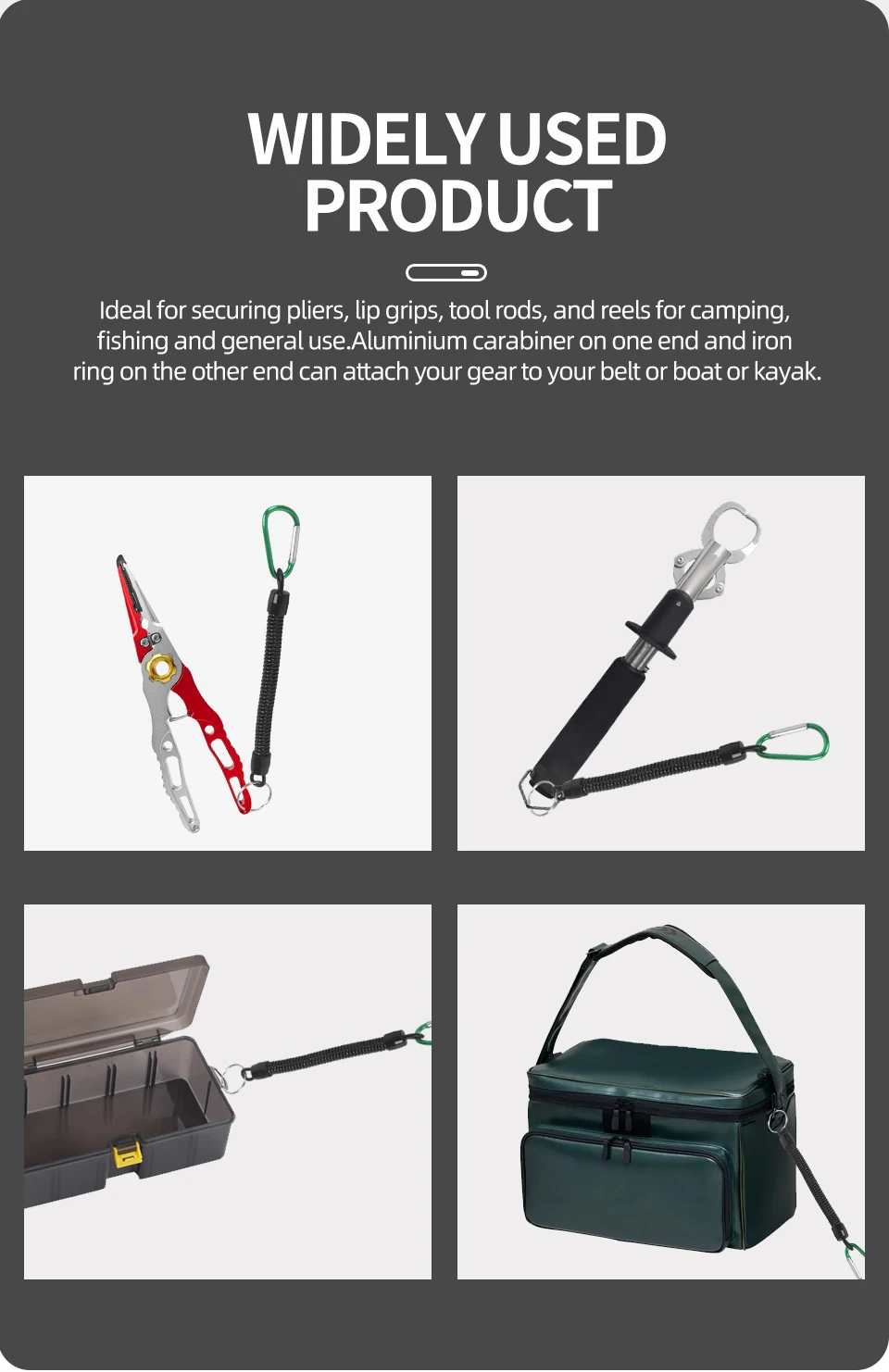 El mosquetón de aluminio en un extremo y el anillo de hierro en el otro extremo pueden sujetar su equipo a su cinturón, bote o kayak.
