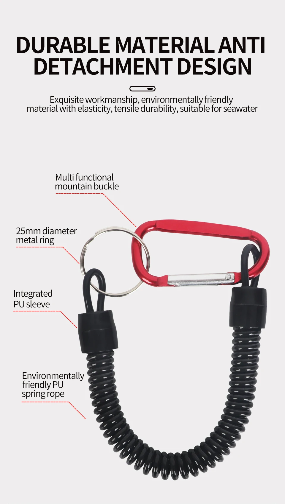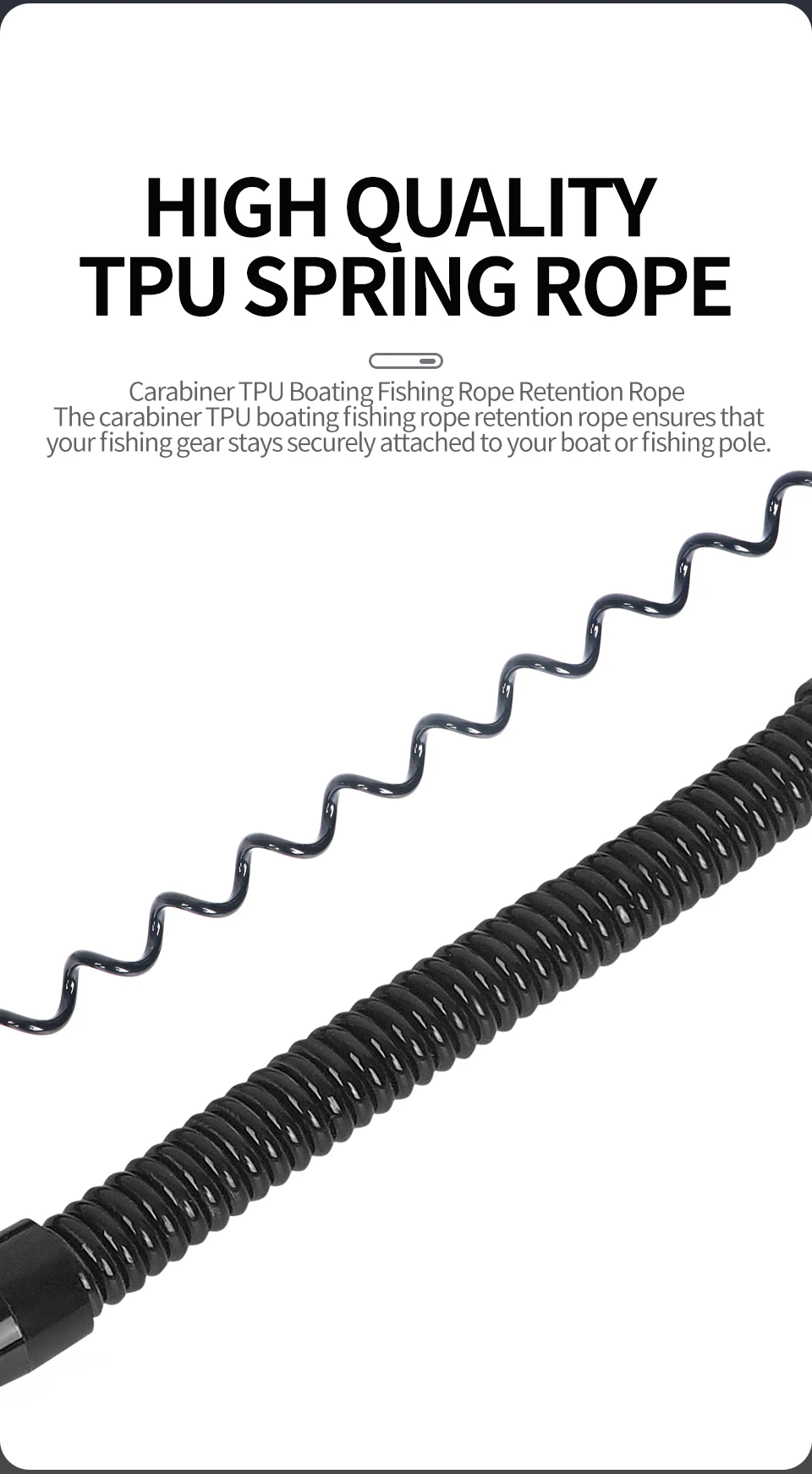 • Cuerda de retención de cuerda de pesca de navegación de TPU con mosquetón: La cuerda de retención de cuerda de pesca de navegación de TPU con mosquetón garantiza que su equipo de pesca permanezca firmemente sujeto a su barco o caña de pescar, evitando pérdidas de capturas.