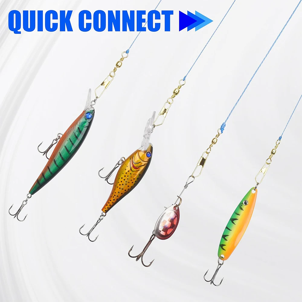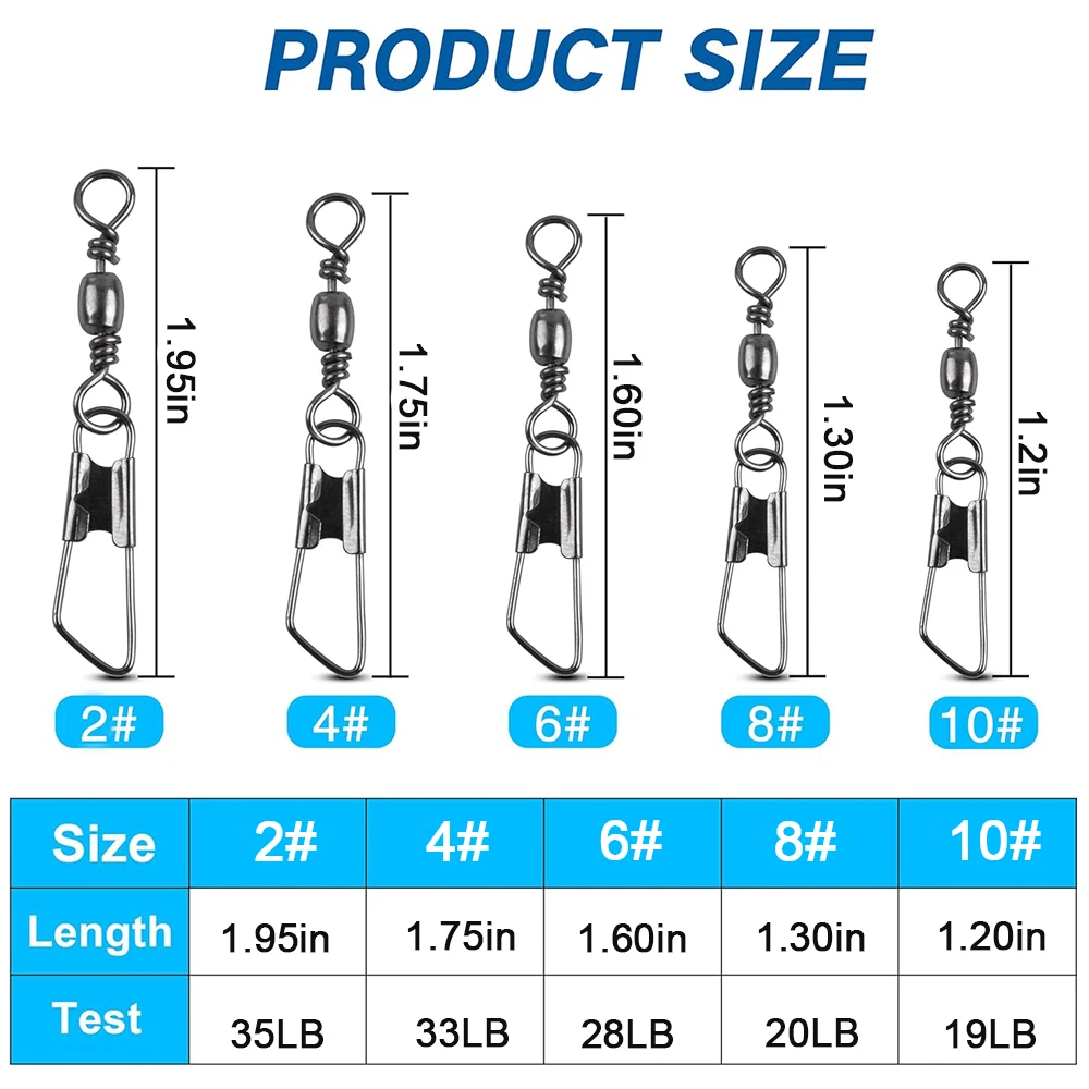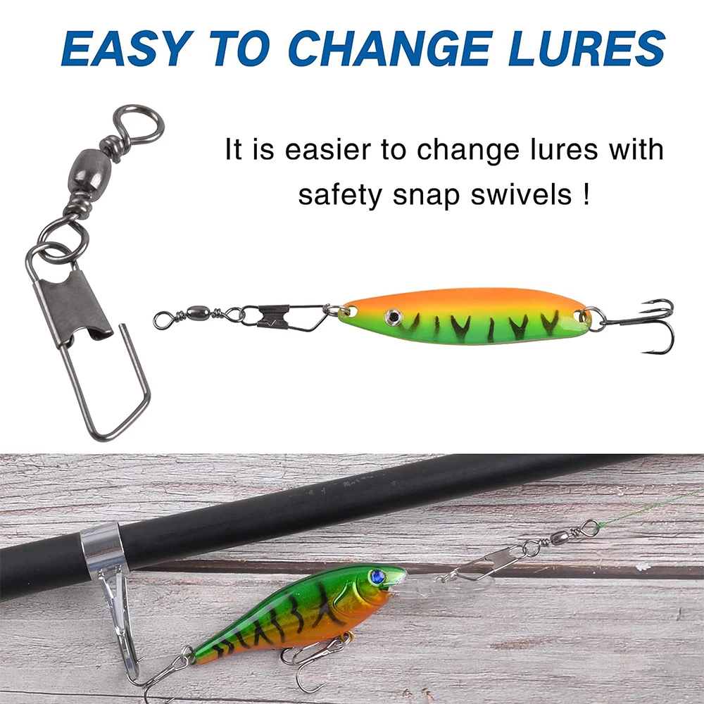 Conexión rápida: el diseño Fishing Swivel Snap permite reemplazar señuelos, líderes y líneas en segundos.Funciona para todo tipo de situaciones de pesca, desde pesca de lubina de agua dulce hasta pesca con curricán de agua salada y jigging.