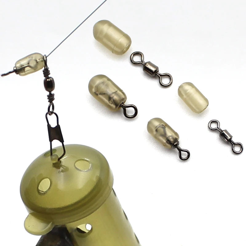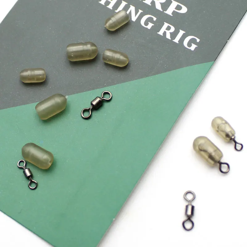 Las cuentas de tope giratorias pueden absorber el impacto causado por el impacto de un comedero o bomba durante los lanzamientos más potentes. La cuenta de goma está diseñada para albergar el anillo superior y el barril del giratorio y dejar el anillo inferior sobresaliendo y libre de girar.