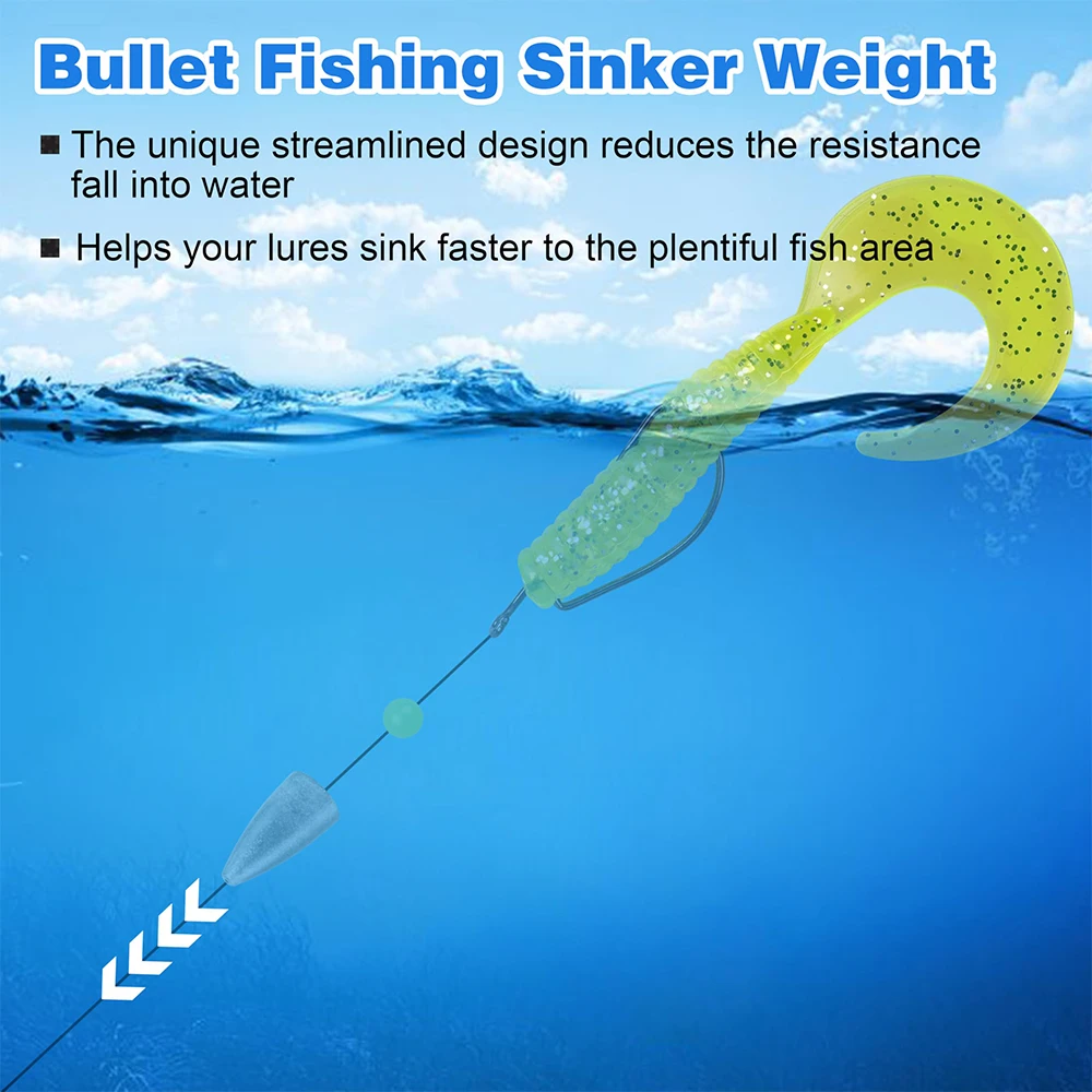 USO MÚLTIPLE: Los pesos de pesca con gusano ayudan a sus señuelos a hundirse más rápido en la zona de peces abundantes. Imprescindible en la pesca de lubina para hacer aparejos Texas, aparejos Carolina y otros aparejos con señuelos blandos.Utilizado en agua dulce o salada.