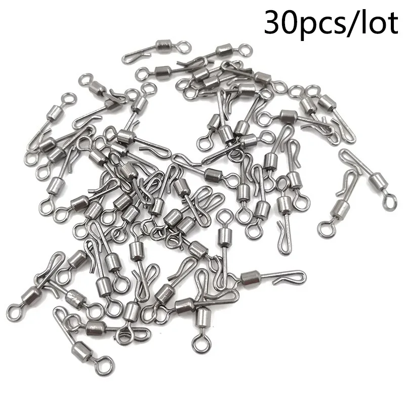 Descripción :30 unids/lote conector de pesca Pin rodamiento giratorio rápido de acero inoxidable con cierre a presión anzuelo señuelo aparejos de pesca