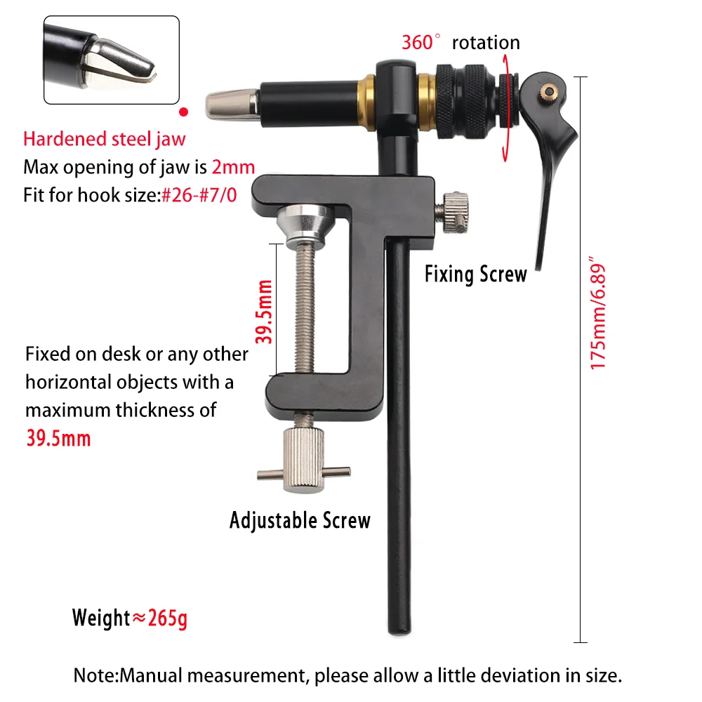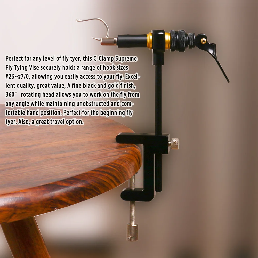 1.Este tornillo de banco para atar moscas es fácil de usar, una abrazadera en C suave y ajustable, que se puede montar en cualquier mesa de hasta 41 mm de grosor, que se fija a su escritorio o superficie de atado o, alternativamente, modelos de pedestal.