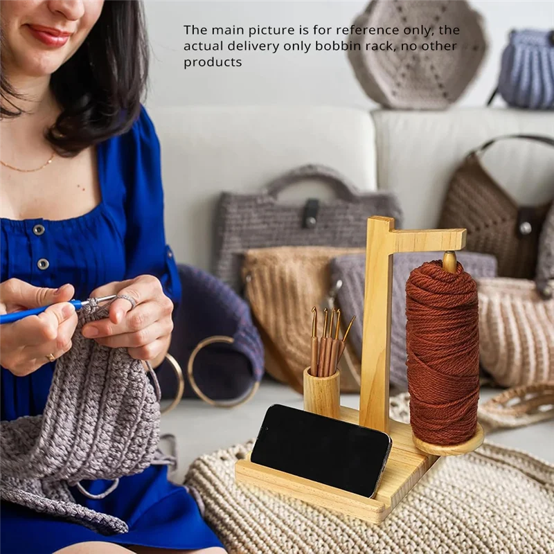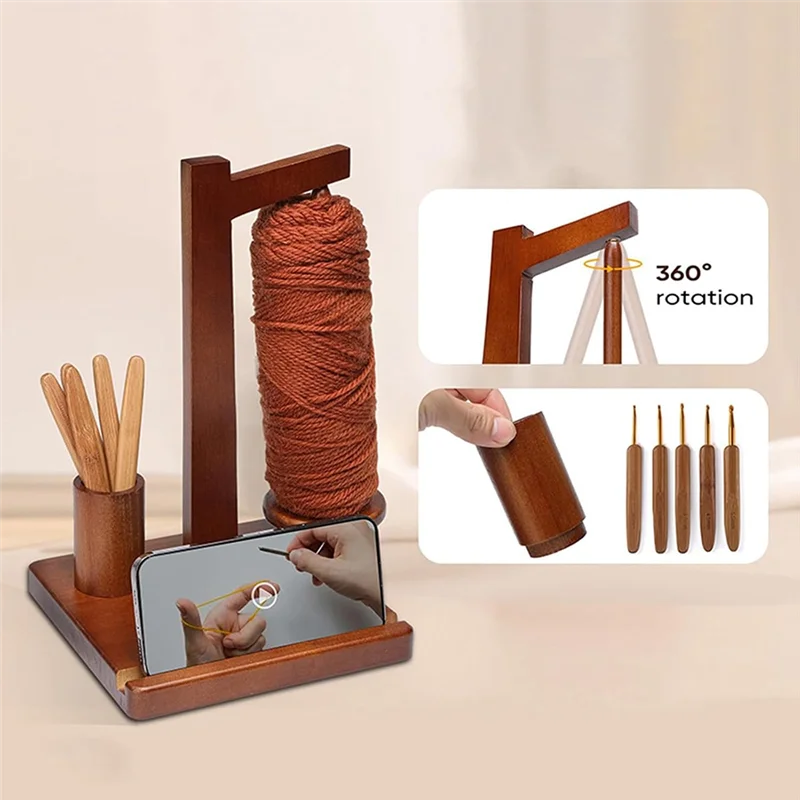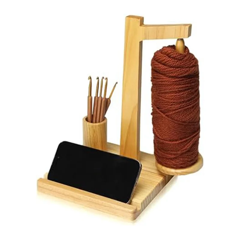 Práctico soporte para teléfono:Este innovador soporte de hilo de madera también funciona como soporte para teléfono, lo que le permite disfrutar de la visualización de videos con manos libres mientras trabaja en sus proyectos de crochet, mejorando sus capacidades multitarea.