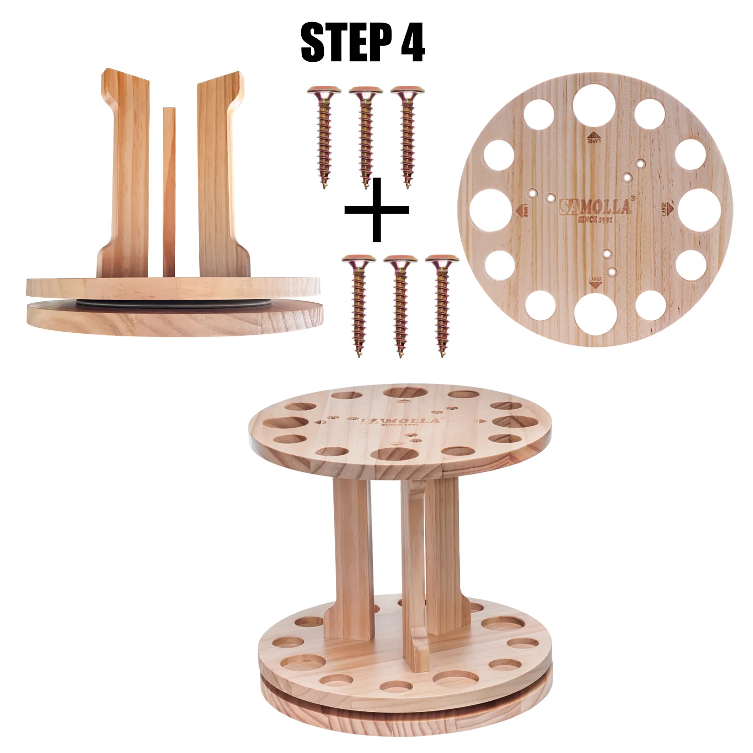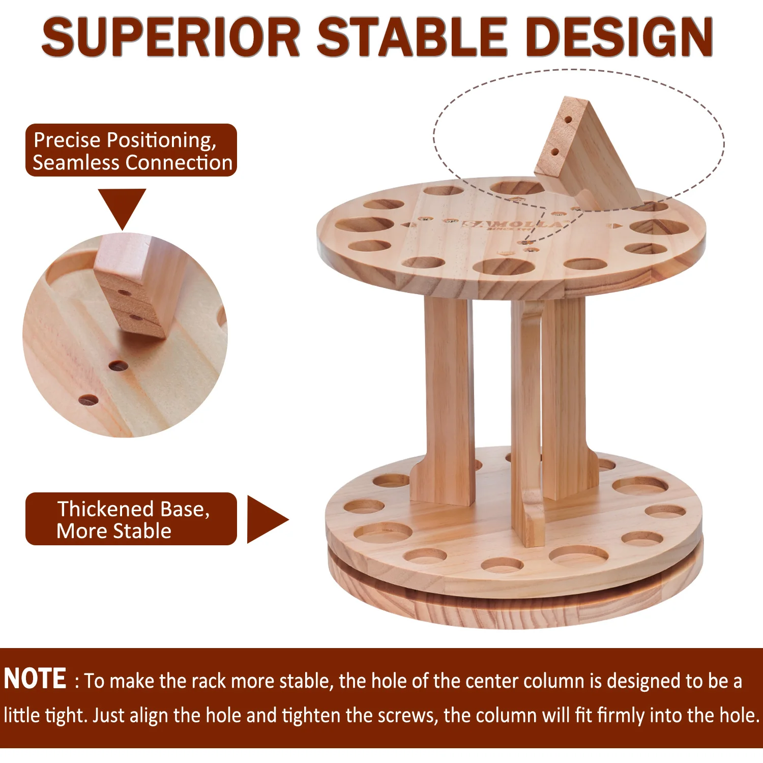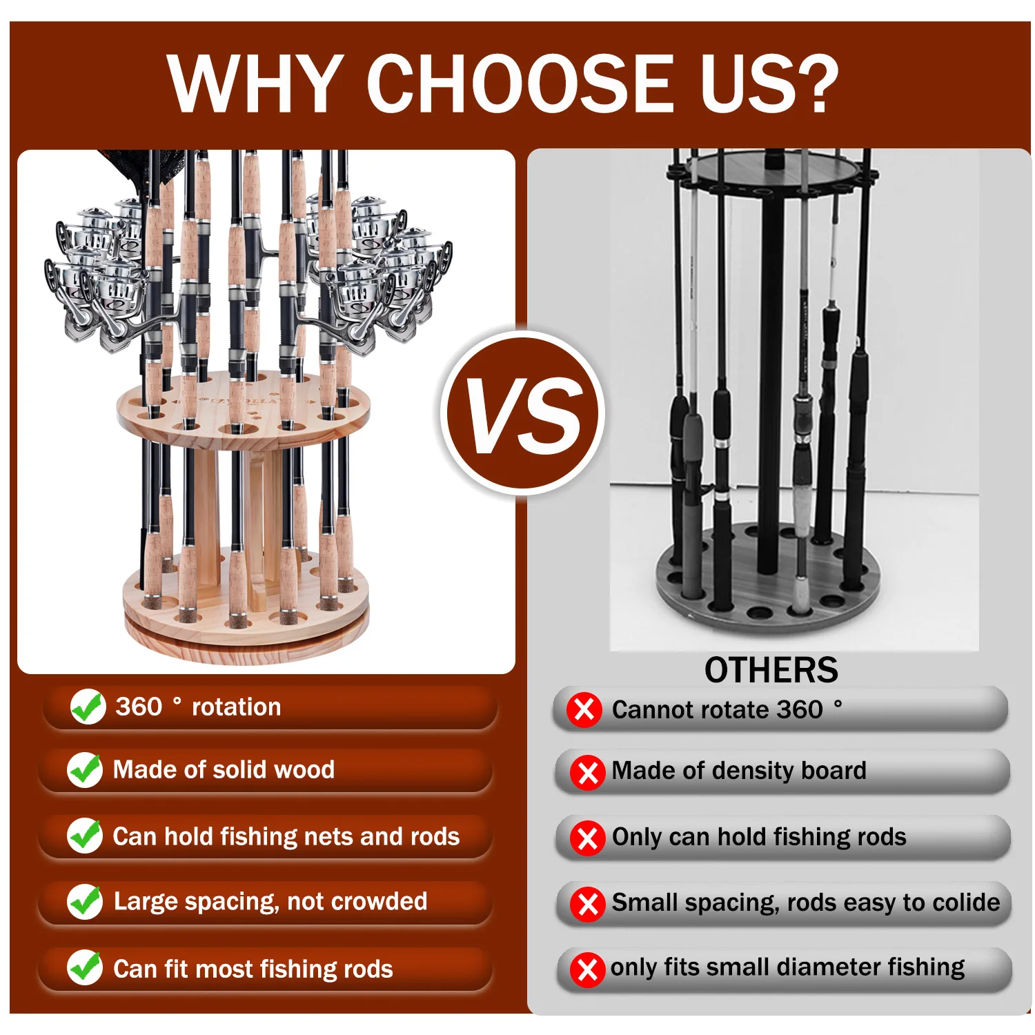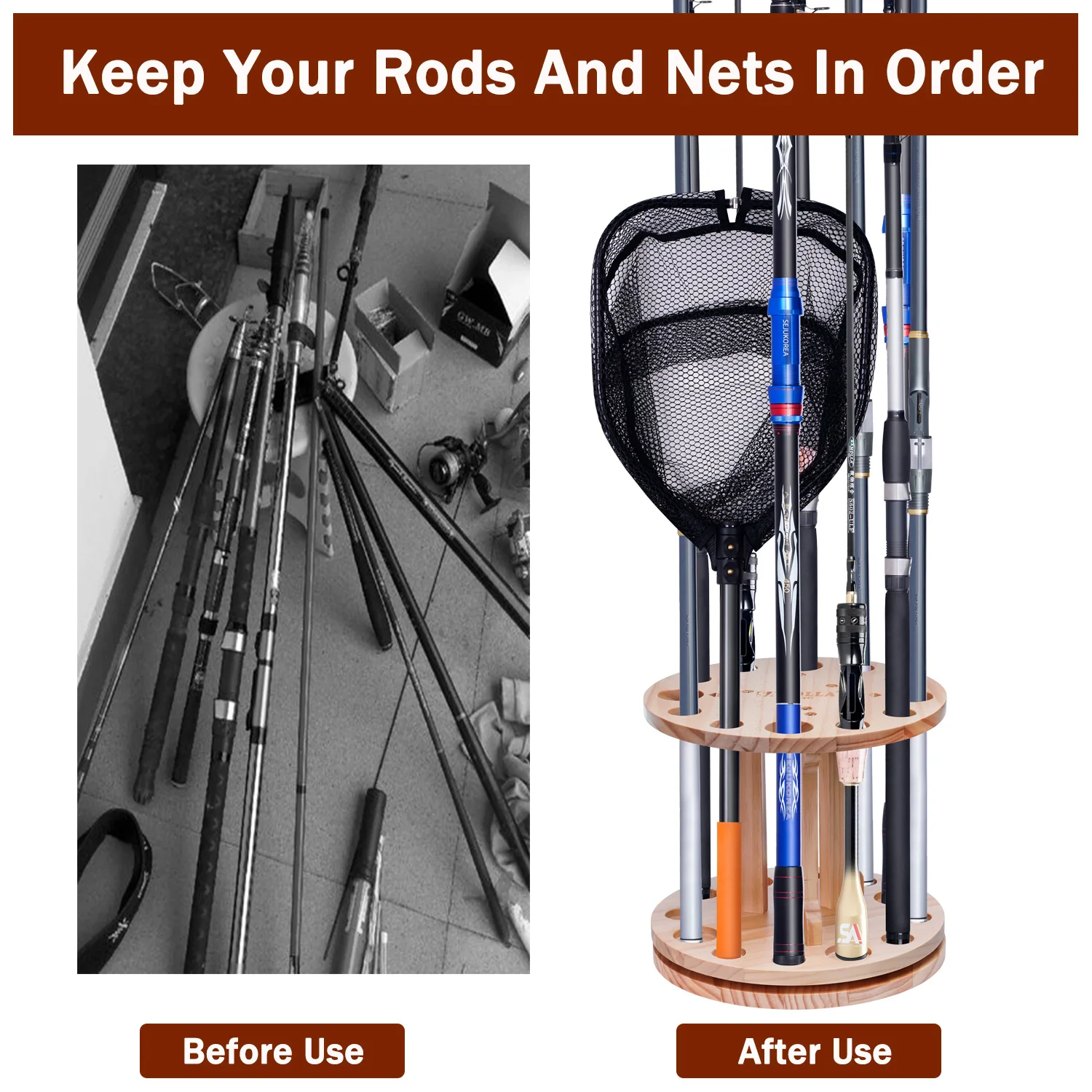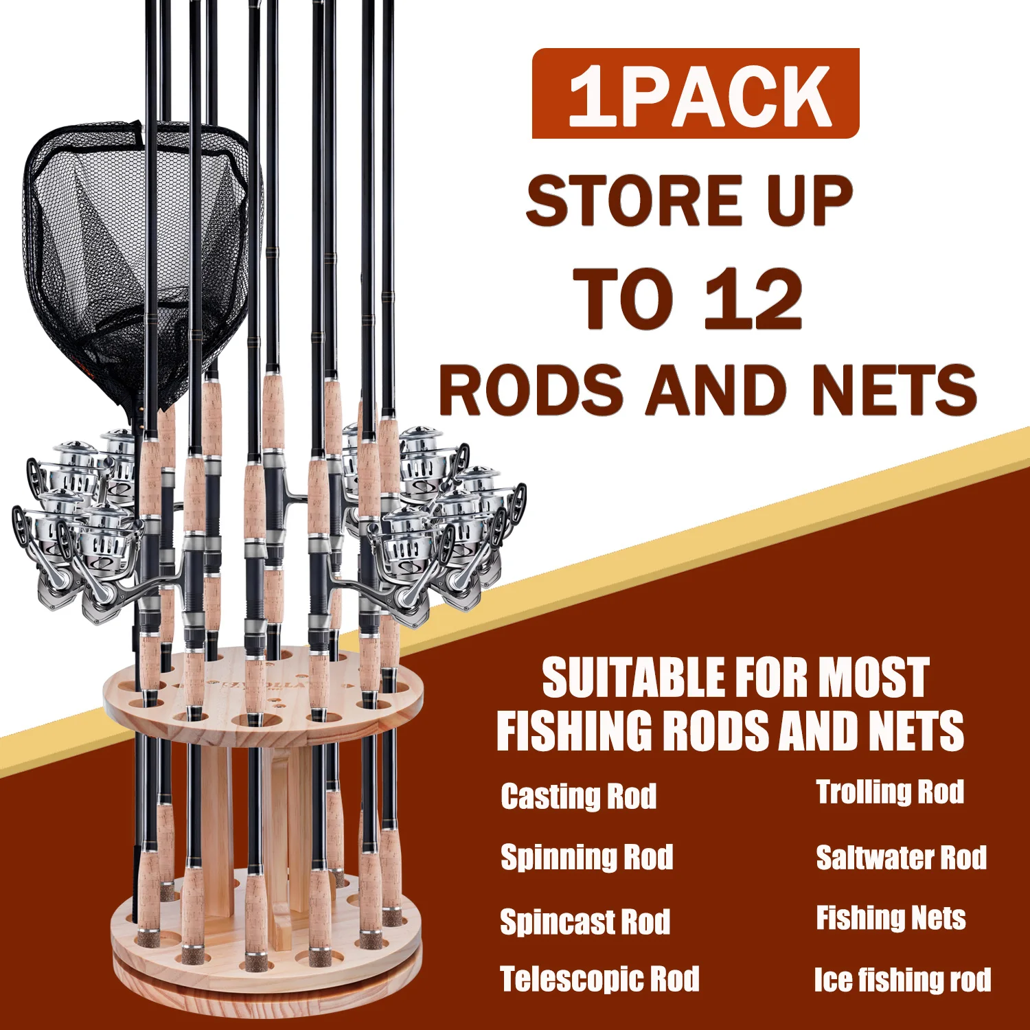 360 ° Soporte redondo para caña de pescar con rotación de madera, 12 ranuras, mejora y fortalece el ahorro de espacio, organizador de almacenamiento, equipo de pesca con techo