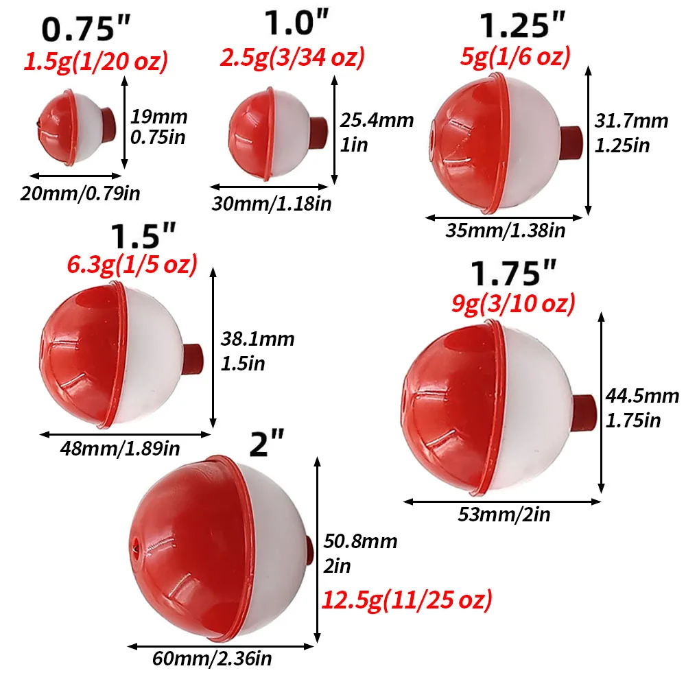 Tamaño de los bobbers flotantes: 0,75 pulgadas, 1 pulgada, 1,25 pulgadas, 1,5 pulgadas, 1,75 pulgadas, 2 pulgadas.