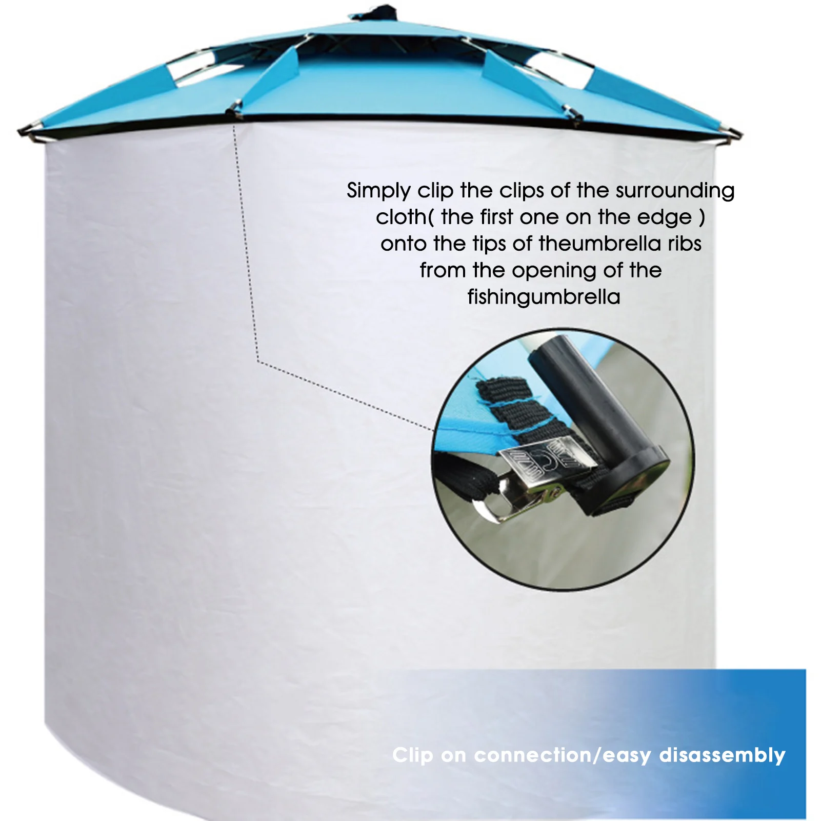 Fácil configuración y estabilidad: equipado con clips resistentes, este refugio para sombrilla de pesca se puede instalar sin esfuerzo en segundos, proporcionando un refugio estable y seguro para sus aventuras de pesca.También es adecuado para acampar, viajes a la playa y otras actividades al aire libre.