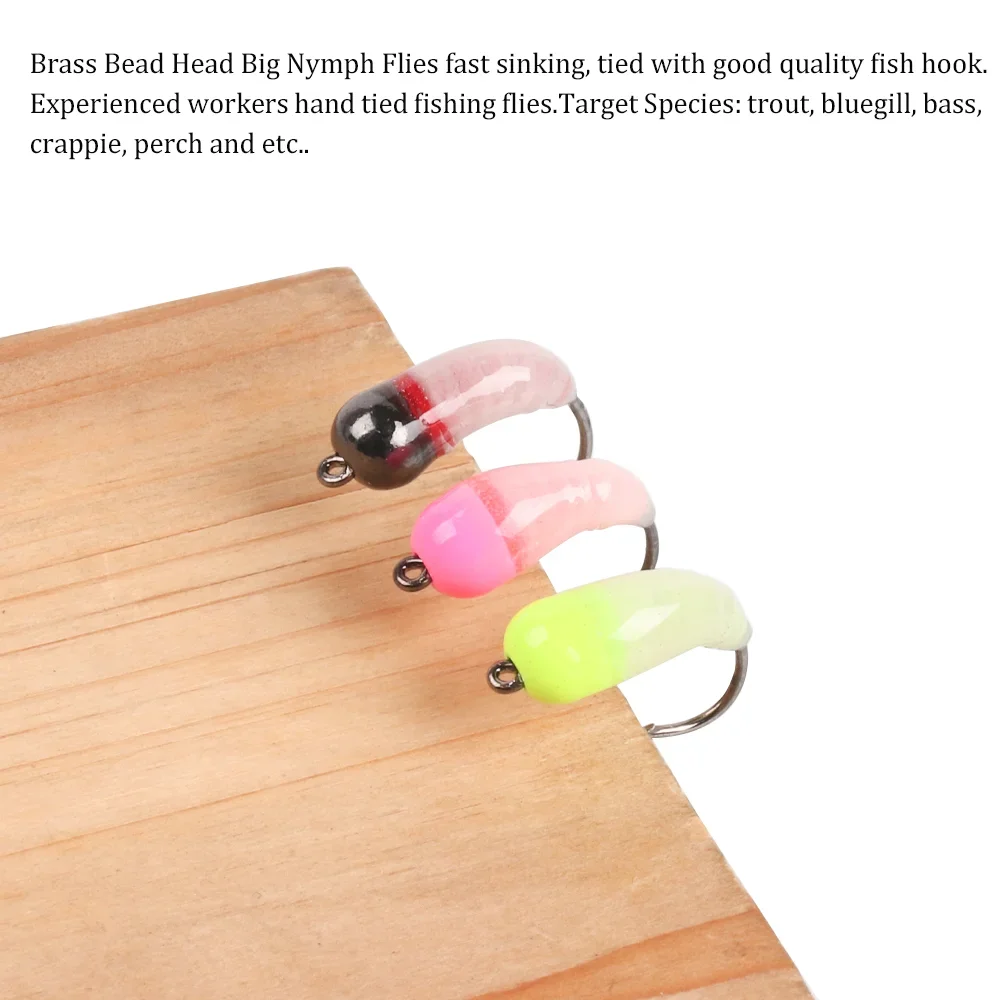 La ninfa mosca con cabeza de cuentas de latón se hunde rápidamente, atada con un anzuelo de buena calidad. Trabajadores experimentados moscas de pesca atadas a mano. Especie objetivo: trucha, herrumbre, lubina, tipo de pez, perca, etc.