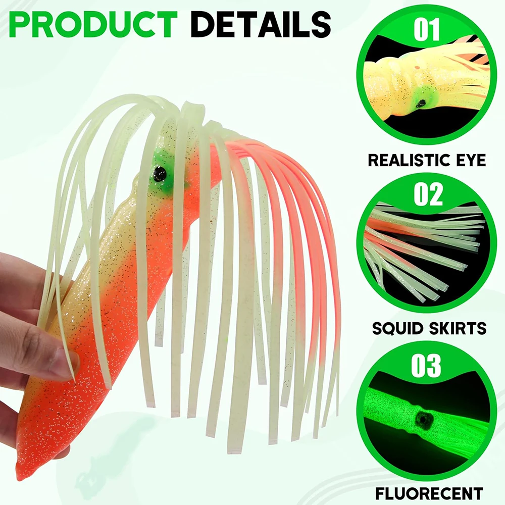 4. Estas faldas de calamar con curricán pescando en agua salada pueden hacer frente a una variedad de necesidades de pesca en agua. Ideal para la pesca de calamares, pesca en agua dulce y pesca en mar. Puede ser ampliamente utilizado para pescar lubina, trucha, lucioperca, atún, Mahi, Marlin, Big Game Fish, etc.