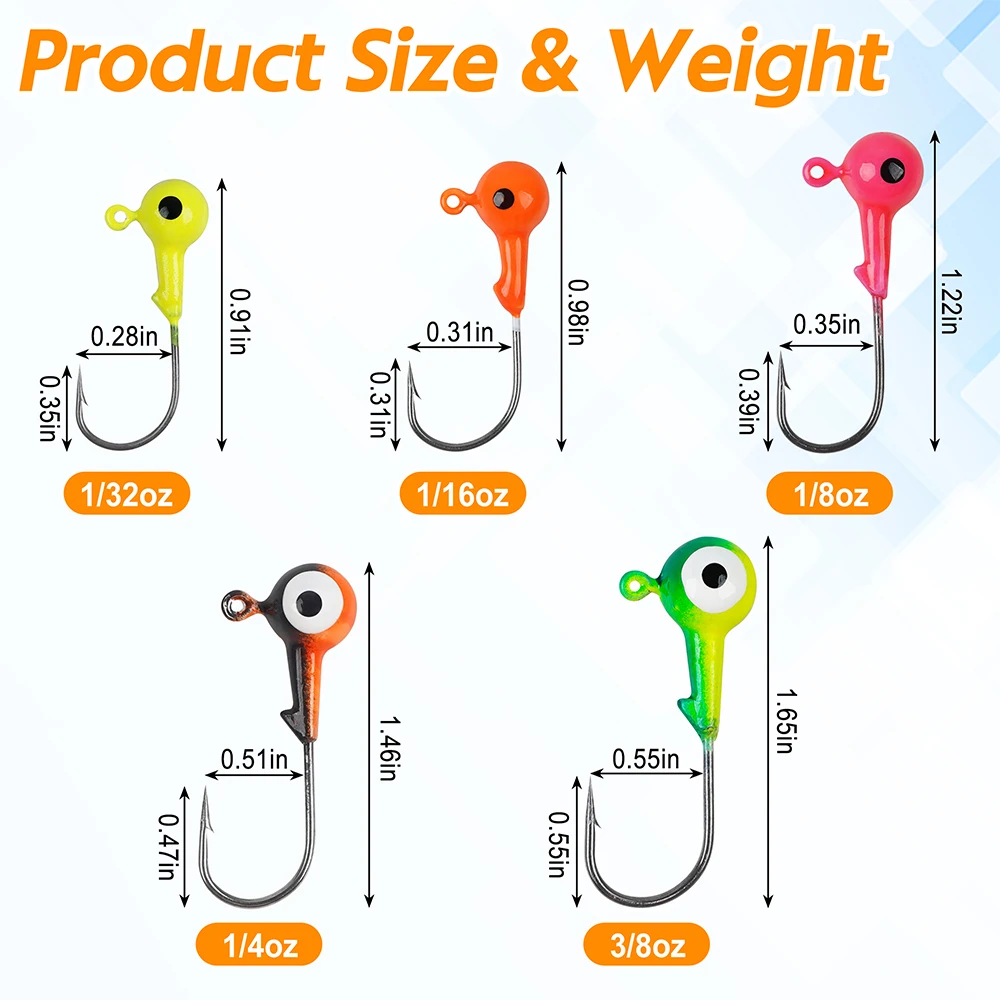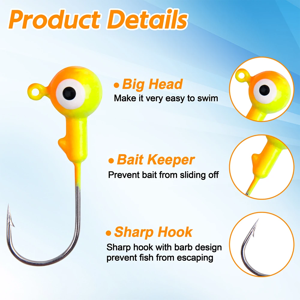 【Diseño de ojales】Cada plantilla de cabeza de bola redonda tiene un ojal transparente para inclinar su hilo de pescar fácilmente y el soporte para cebo evita que los señuelos blandos se resbalen.