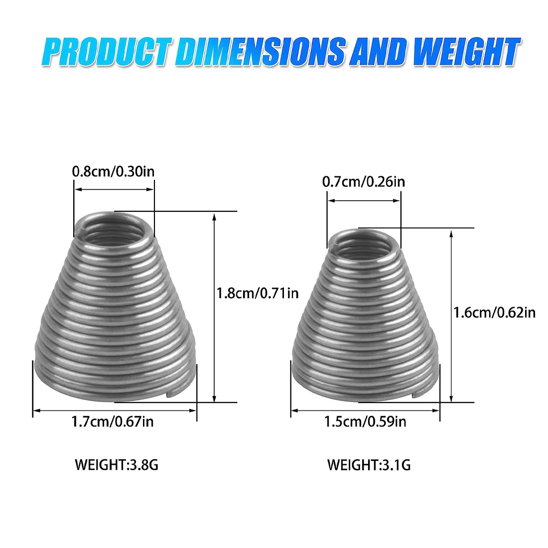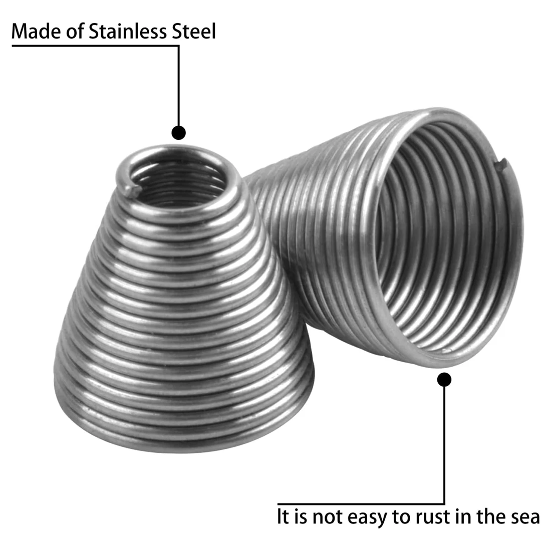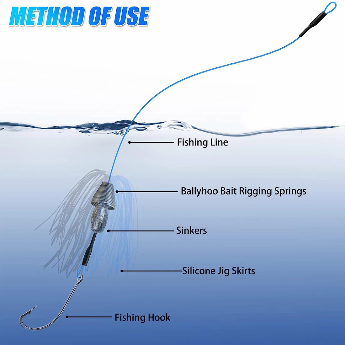 2.Es un resorte cónico bien enrollado.Coloque el extremo ancho hacia el ballyhoo y asegure el cebo al aparejo de alfileres.