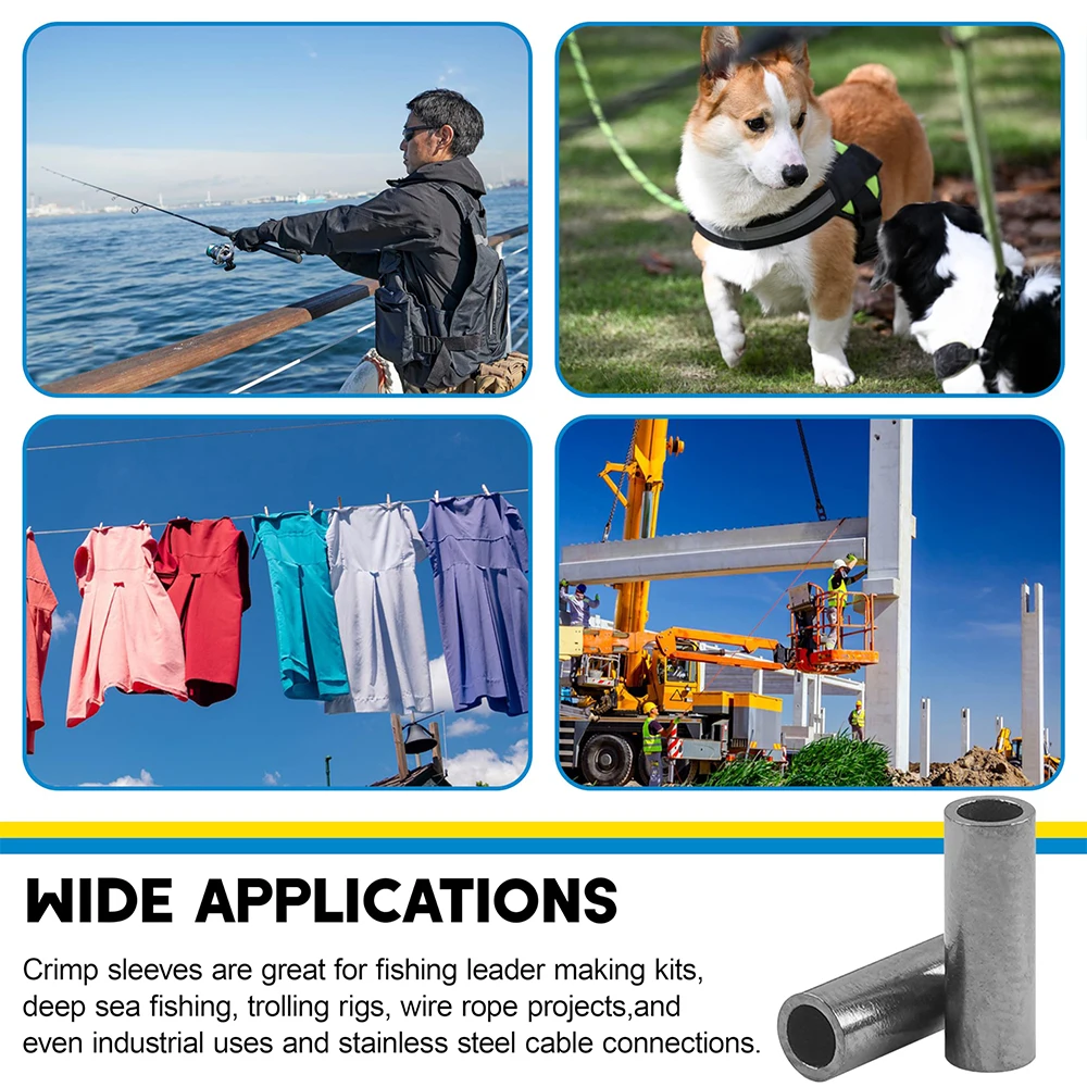 Amplias aplicaciones: las mangas de engarce para pesca son excelentes para hacer aparejos de pesca con curricán y de fondo, también se aplican en correas para perros, tendederos, mangas de engarce para pesca, aparejos marinos, industriales o cualquier otra cosa que requiera un cable fuerte.