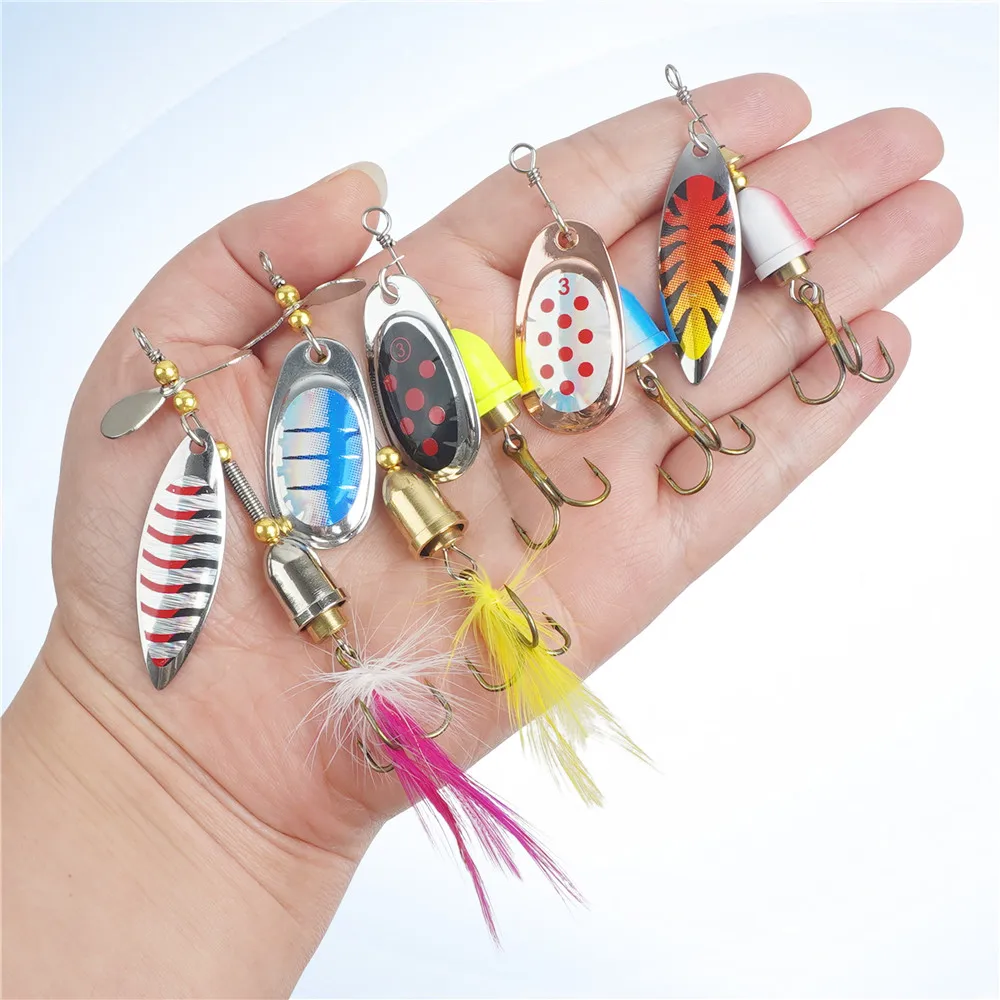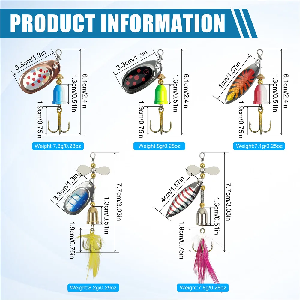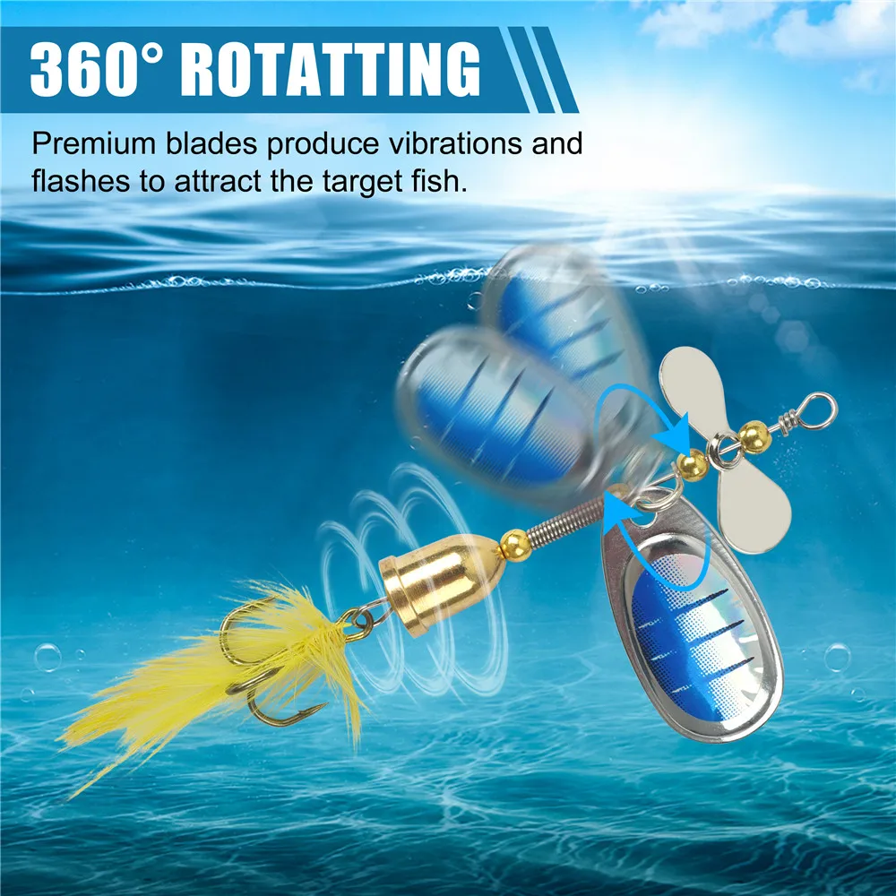 1.Cada señuelo de trucha viene con anzuelos triples de plumas afilados con mangas atractoras de colores brillantes.El señuelo de cuchara de metal de primera calidad proporciona destellos y vibraciones continuos.