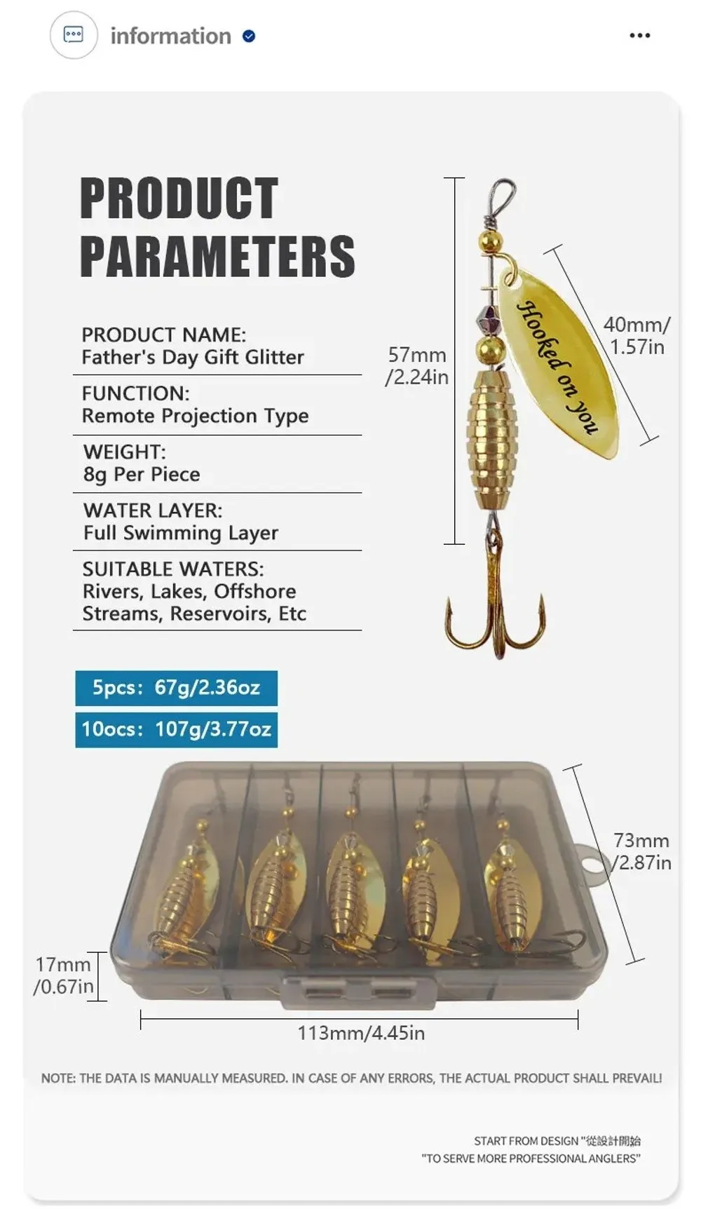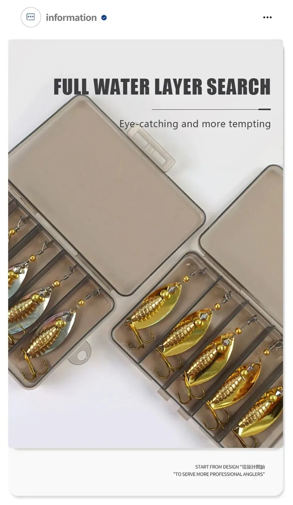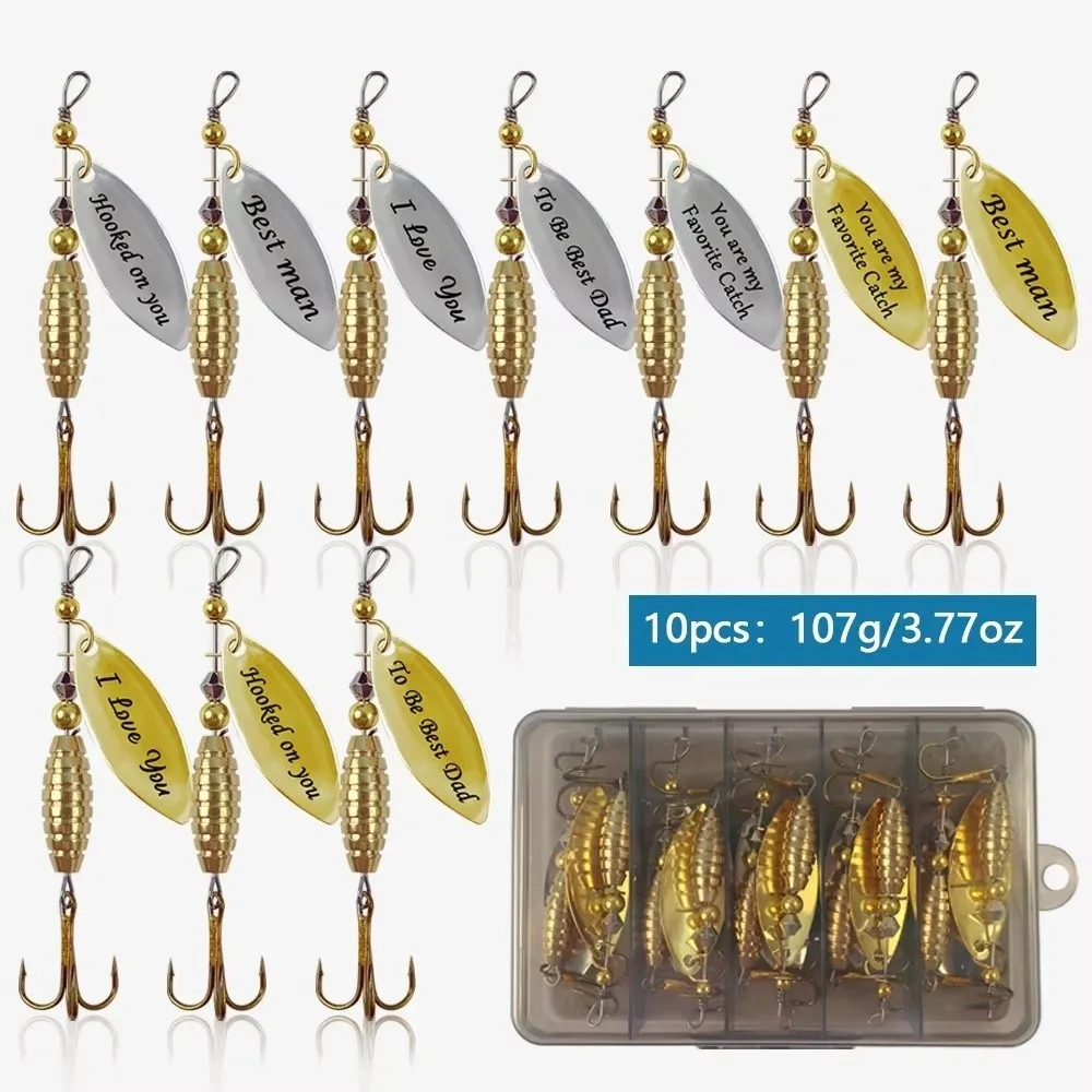 Features: 1.Metal Spoon Design: The leaf-shaped metal spoon spinner fishing lure produces noise and reflections when spinning in the water, effectively attracting fish. 2.Reflective Surface for Quick Attraction: The spoonbait crankbait features a highly reflective surface that enhances light reflection, increasing its attractiveness during fast spin. 3.Forward Weight for Easy Casting: The fishing wobbler is designed with forward weight distribution, allowing effortless long-distance casting and quick water slicing. 4.Dynamic Copper Weight: Equipped with copper weights and rolling beads that create sound upon collision, this artificial bait tempts large fish to attack. 5.Sharp Barbed Treble Hook: The hard bait is fitted with a sharp barbed treble hook for high penetration and strength, ensuring successful catches. 10pcs Boxed Metal Spoon Spinner Fishing Lure with Treble Hook Spoonbait Crankbaits Fishing Wobblers Rotating Spoon Kit Fishing Gift for Dad Father Features: 1.Metal Spoon Design: The leaf-shaped metal spoon spinner fishing lure produces noise and reflections when spinning in the water, effectively attracting fish. 2.Reflective Surface for Quick Attraction: The spoonbait crankbait features a highly reflective surface that enhances light reflection, increasing its attractiveness during fast spin. 3.Forward Weight for Easy Casting: The fishing wobbler is designed with forward weight distribution, allowing effortless long-distance casting and quick water slicing. 4.Dynamic Copper Weight: Equipped with copper weights and rolling beads that create sound upon collision, this artificial bait tempts large fish to attack. 5.Sharp Barbed Treble Hook: The hard bait is fitted with a sharp barbed treble hook for high penetration and strength, ensuring successful catches. Specification: Origin: Mainland China Size: Box 113x73mm 4.45x2.87inch Bait 57mm/2.24inch Material: Metal Weight: 8g Package Included: 5/10pcs Spoon Lures